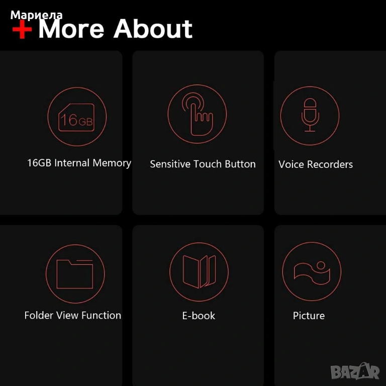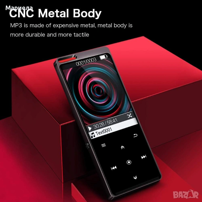 Този MP3 плейър поддържа Bluetooth свързаност, FM радио, запис на глас, разглеждане на снимки, разглеждане на файлове и четене на електронни книги.
