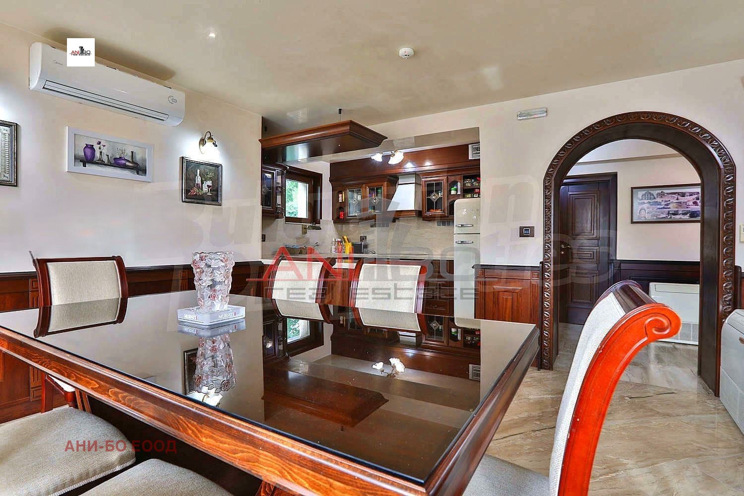 трапезария с кухня /подови настилки от италиански мрамор, обзавеждането на кухнята е от масив/
