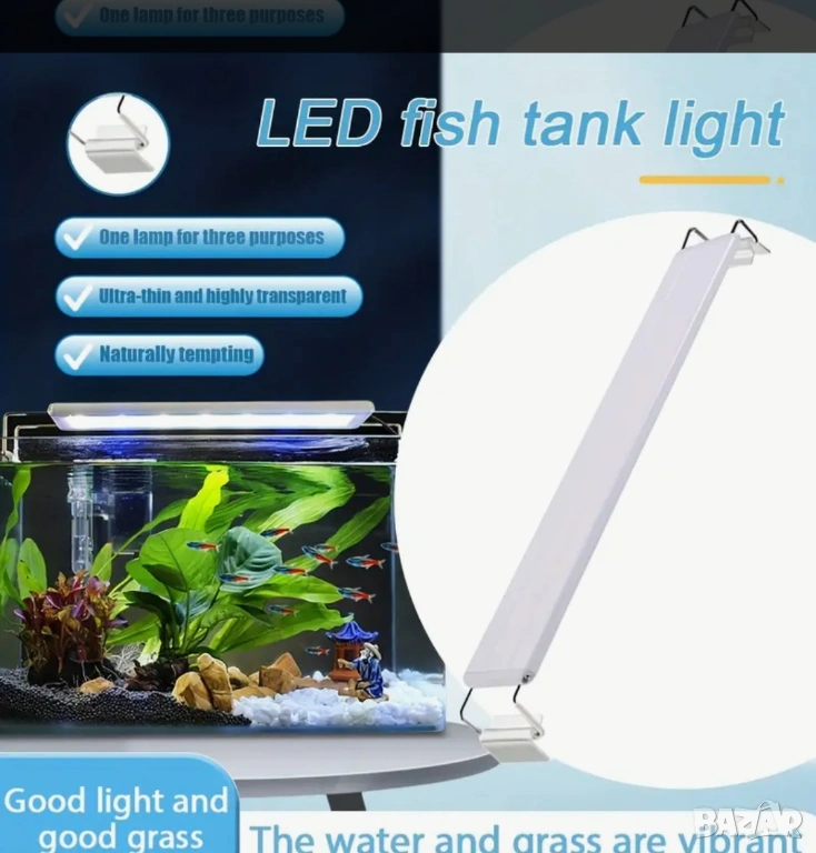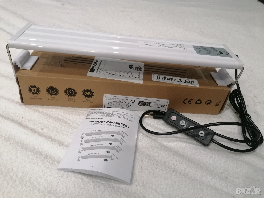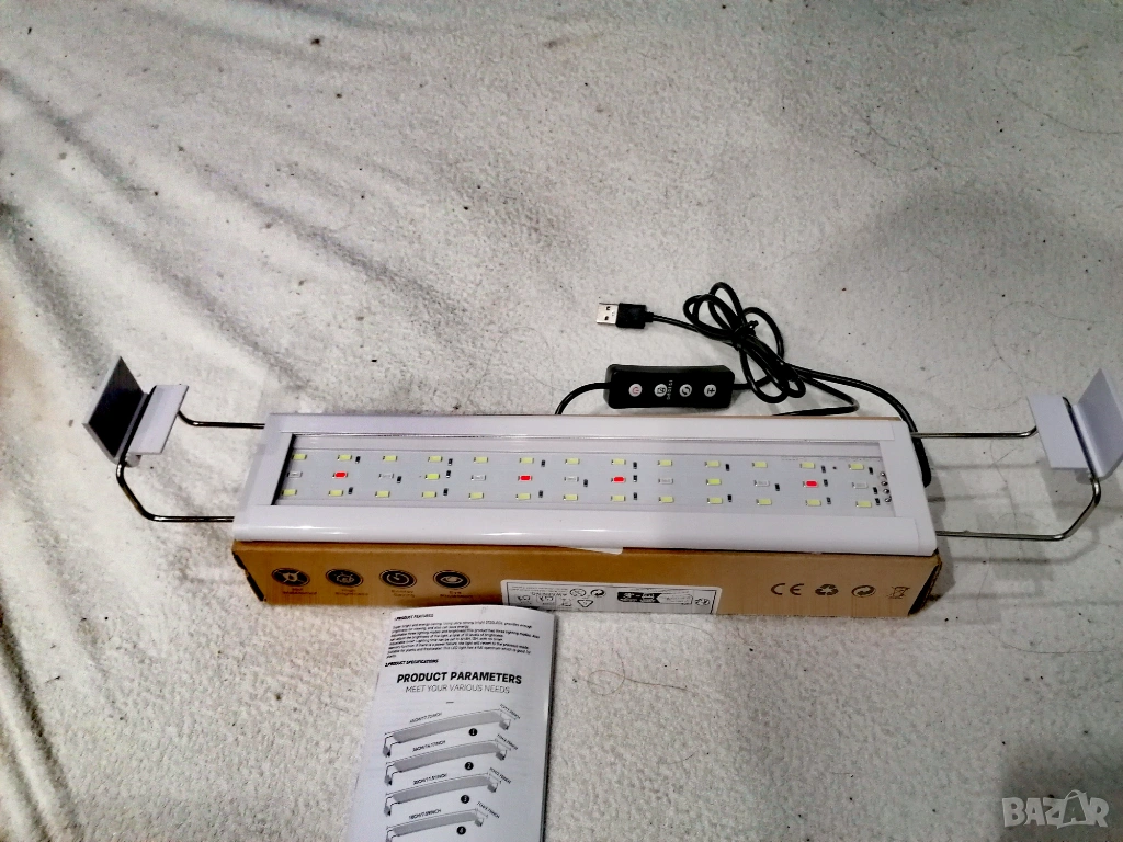 Продавам нова аквариумна лампа 30см,цвят бял. Има таймер за 6, 8,12ч.Регулиране на яркостта, 4-ри режима на осветление, алуминий. Идеална за растения. USB-36V Стилно и красиво осветление с отлично качество. Цена 13€.