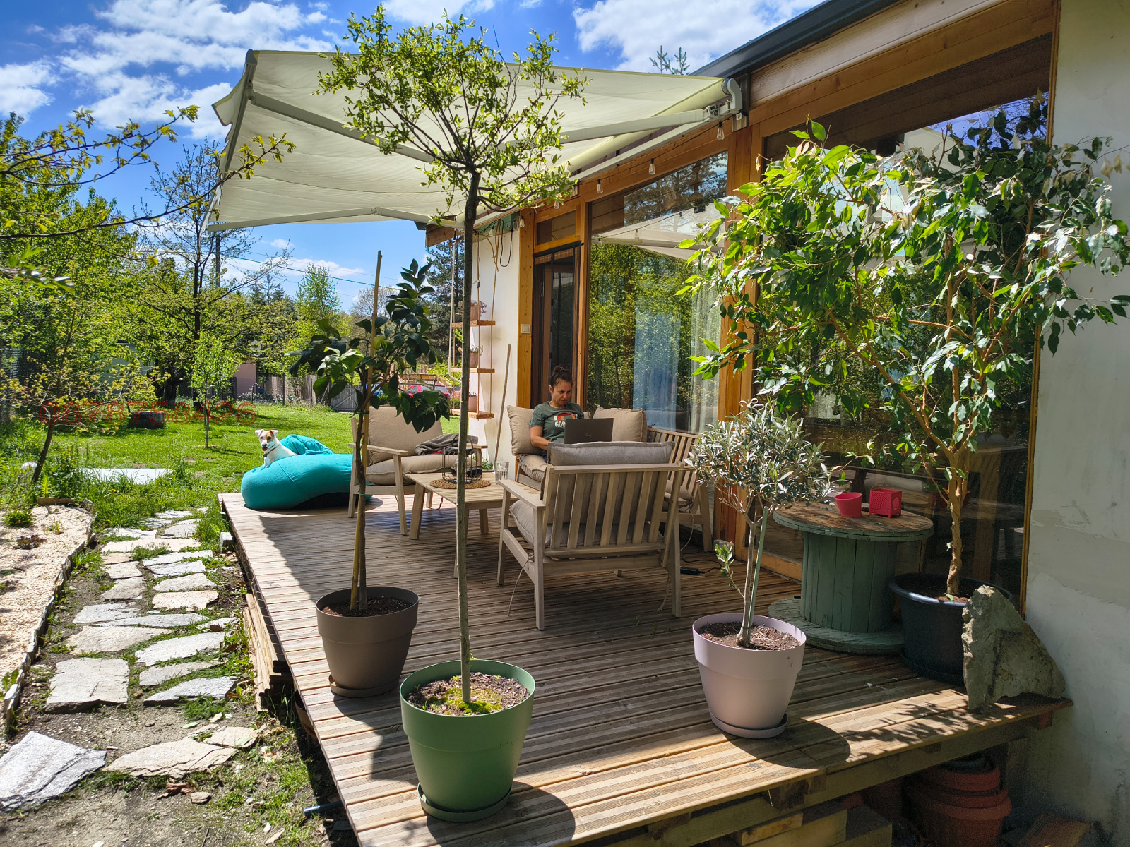 Къщата е с много естествена светлина и приятна връзка с двора.