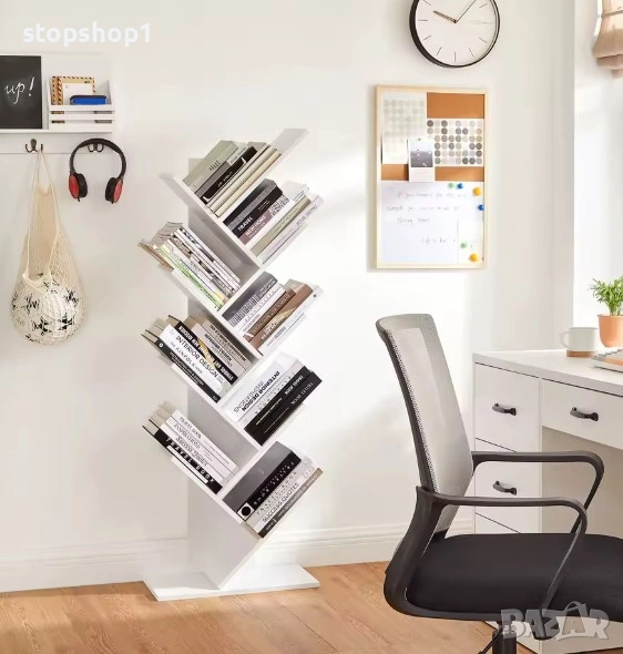 1. ЗА ЛЮБИТЕЛИ НА КНИГИ СЪС СТИЛ: Със своя геометричен силует, тази етажерка с форма на дърво е привлекателна мебел за вашия домашен офис; напълнете многосекционните рафтове с любимите си книги, за да създадете привличаща вниманието визия.