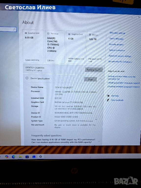 HP Omen гейминг лаптоп с 17.3 инчов дисплей, i5 процесор, GTX 1060 видеокарта, 8GB рам, 1TB хард диск и 75Hz обновяване на екрана.