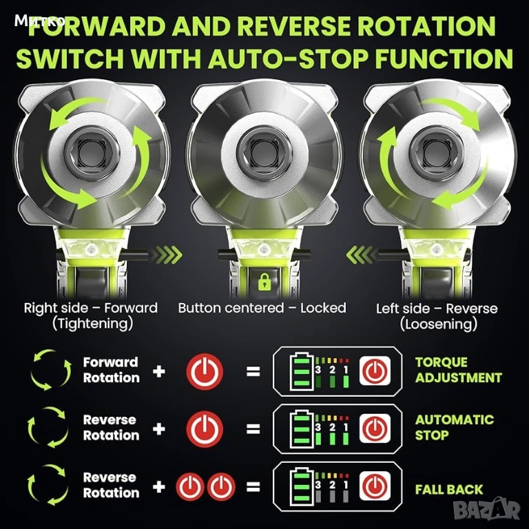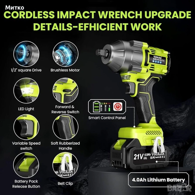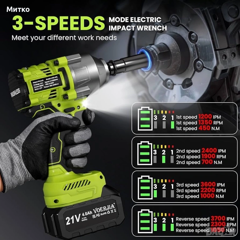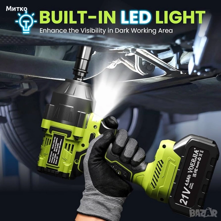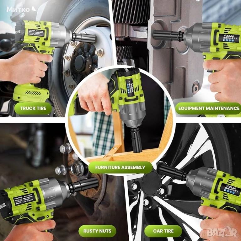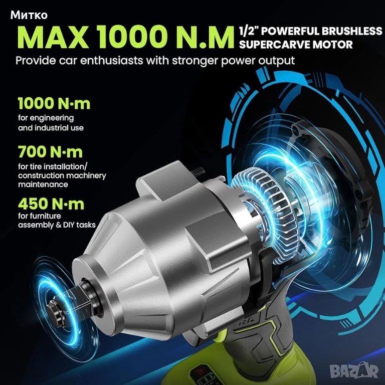 Висок въртящ момент от 1000 Nm – Създаден за трудно отстраняване на колела и болтове. Осигурява максимален въртящ момент до 1000 Nm, като лесно отстранява упорити гайки на колела, ръждясали болтове и стегнати крепежни елементи. Идеален за смяна на автомобилни гуми, поддръжка на превозни средства, ремонти в гараж и тежки „Направи си сам“ задачи, без да е необходимо посещение на сервиз.