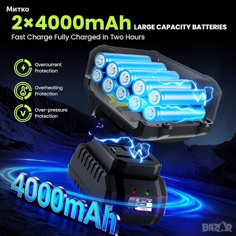 Две батерии 21V 4.0Ah – Дълго време на работа и бързо зареждане. Доставя се с 2×21V 4.0Ah литиеви батерии, предлагащи до 60 минути непрекъсната работа (в зависимост от натоварването). Двете батерии позволяват едната да се зарежда, докато другата се използва, свеждайки времето за престой до минимум. Включено е бързо зарядно устройство.