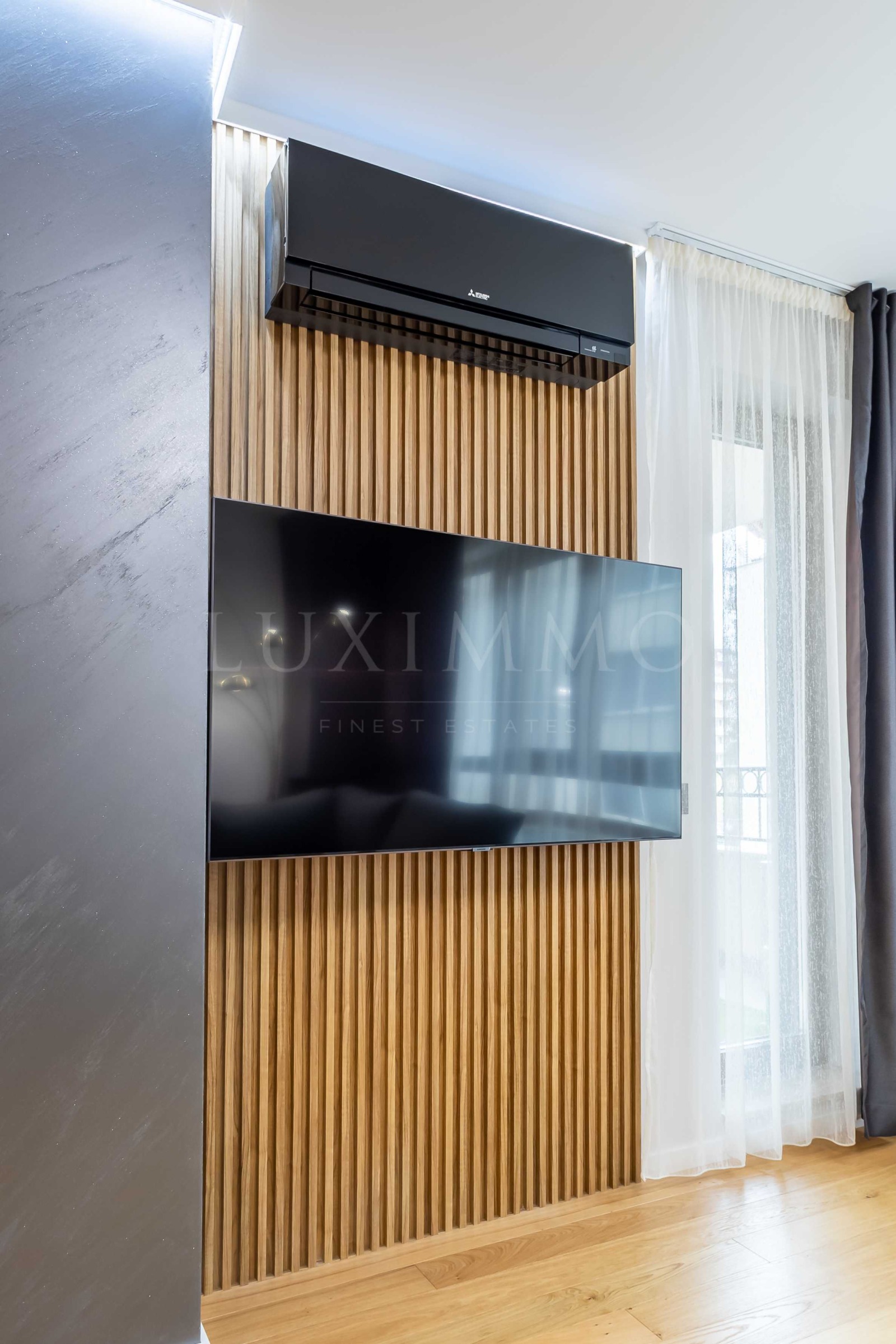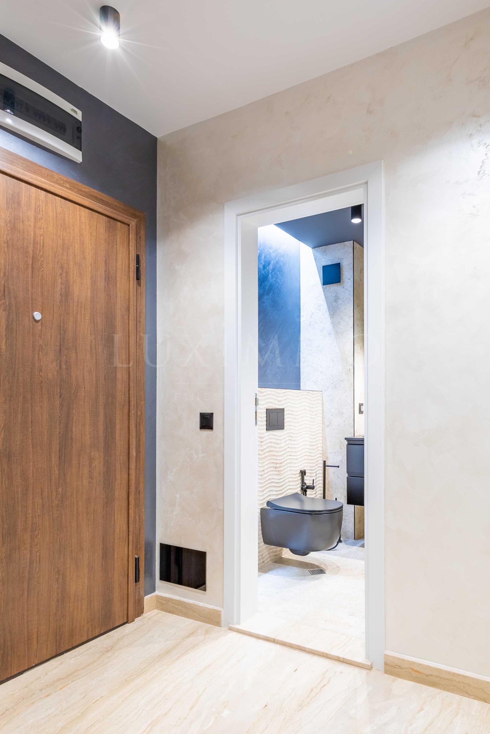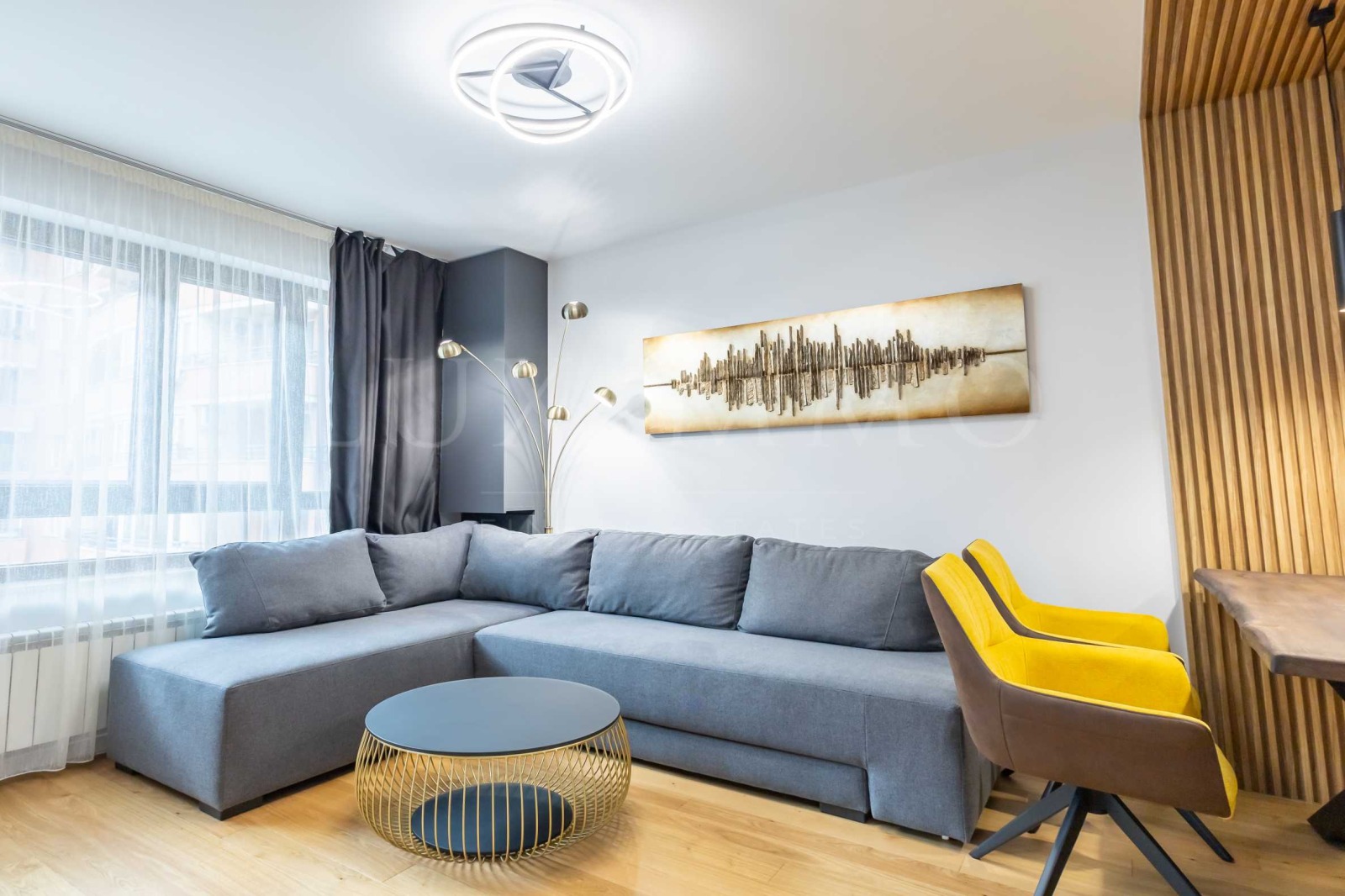 Ситуирано на трети етаж от общо пет, жилището разполага с южно изложение и изключително стилен и модерен интериор. Подът е от естествено дърво и големи мраморни плочи, а обзавеждането е максимално практично и удобно, и същевременно много изискано.