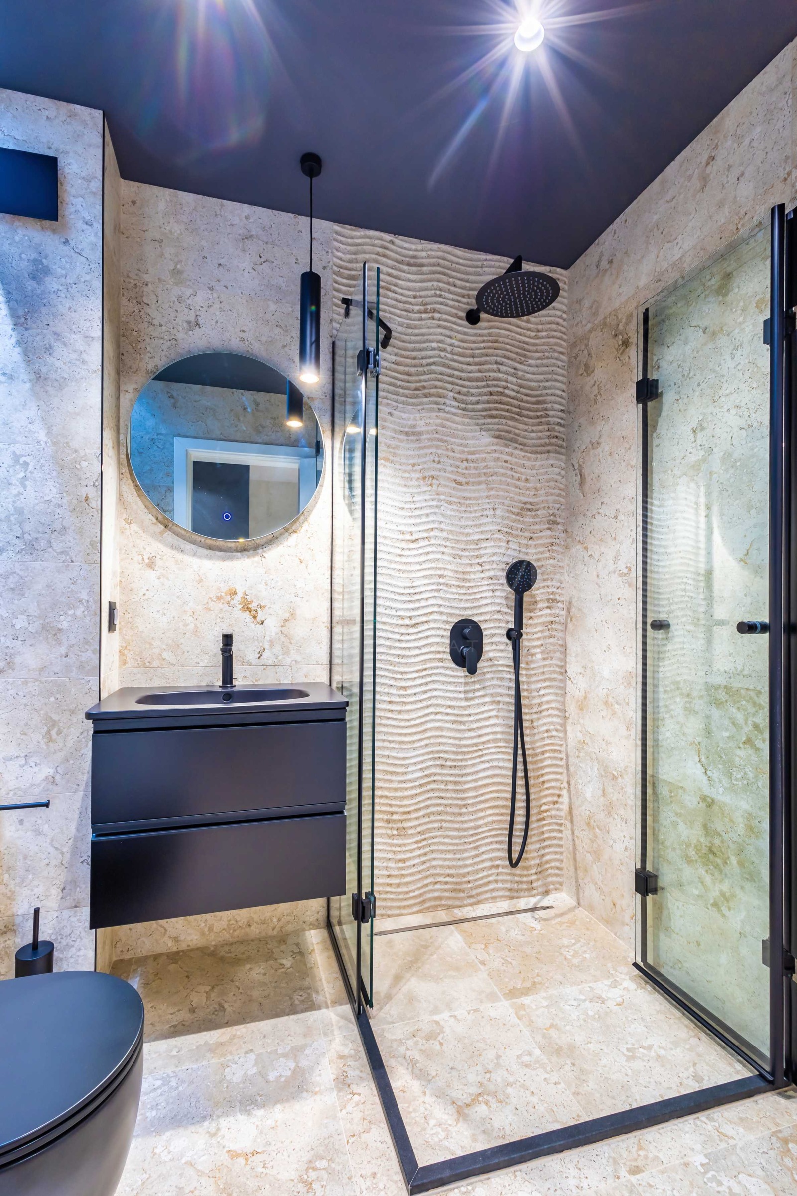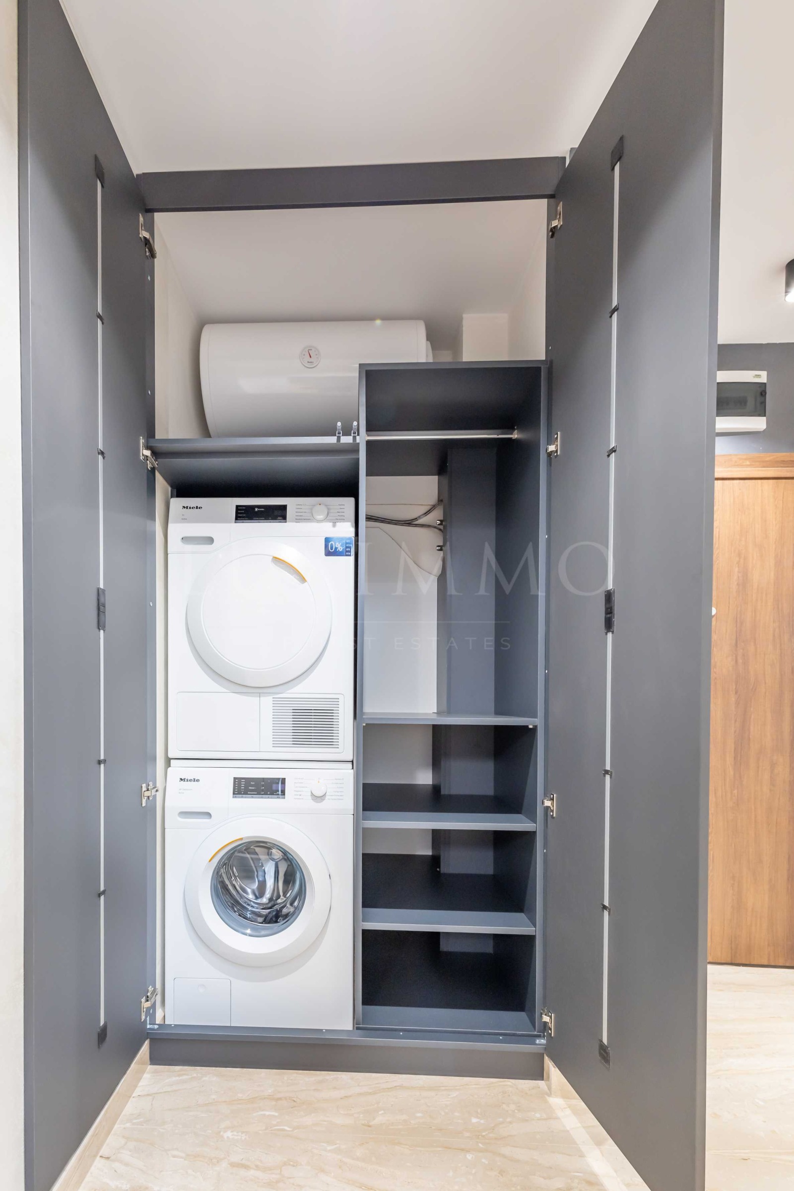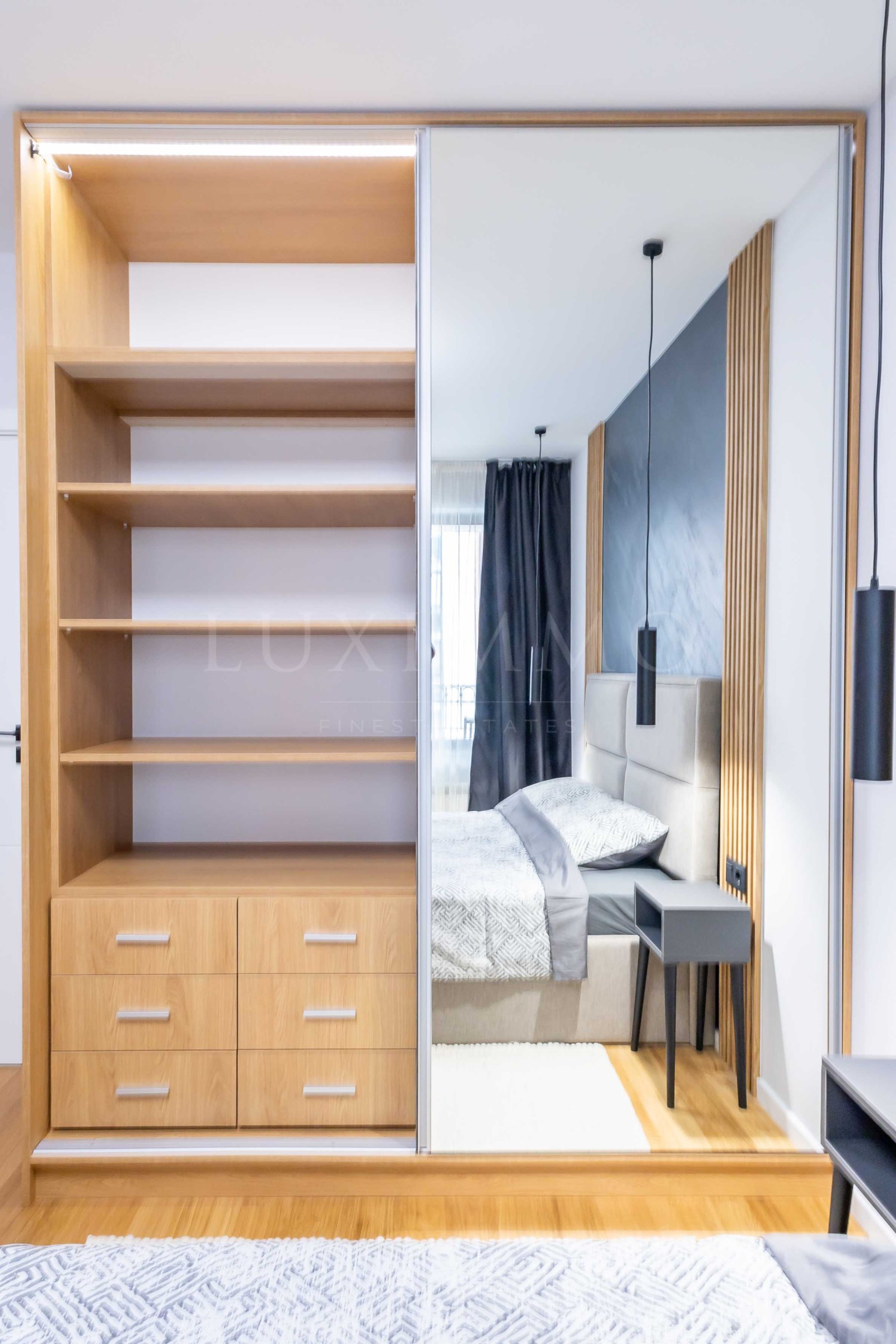 Ситуирано на трети етаж от общо пет, жилището разполага с южно изложение и изключително стилен и модерен интериор. Подът е от естествено дърво и големи мраморни плочи, а обзавеждането е максимално практично и удобно, и същевременно много изискано.