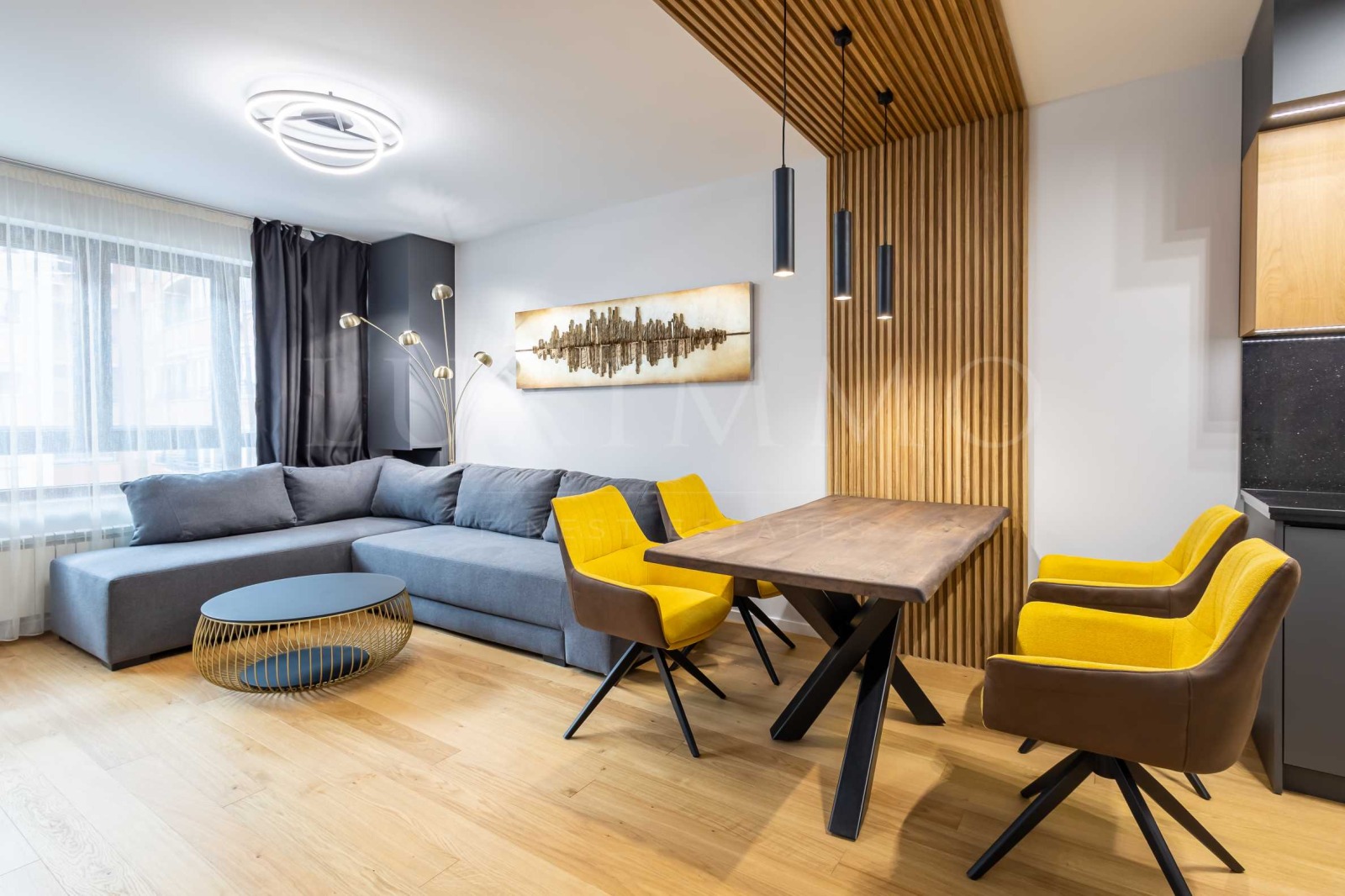 Дневната разполага с вградена кухня с гранитен плот, скрити контакти и осветления, и уреди най-висок клас Miele. На разположение на новите наематели ще има вграден хладилник, съдомиялна, фурна, котлони, мивка и батерия. Около голямата трапезна маса с плот от естествено дърво са подредени жълти кресла с удобни облегалки и подлакътници. Ъгловият диван може лесно да се превърне в две легла или в спалня, при нeобходимост.