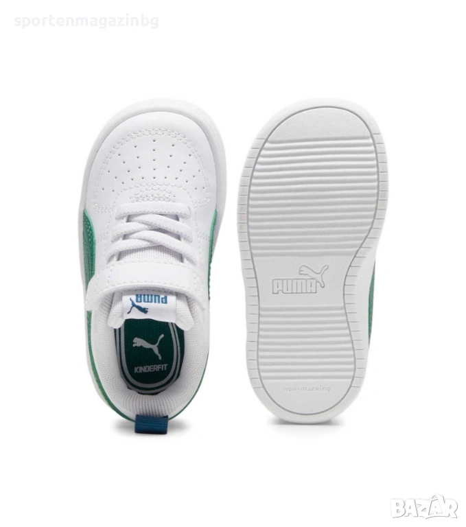 Стабилна конструкция в горната част изработена от висококачествена синтетична кожа. Допълнително подсилени в областта на петата и пръстите. Ластични връзки и велкро лента в горната част за лесно обуване и събуване. Надпис с лого Puma върху езика. PUMA Formstrip от двете страни. Текстилна кука в задната част за по лесно обуване. Нисък профил за по-голяма свобода при движение. Вътрешната текстилна част заедно със стелката осигуряват невероятна мекота и комфорт с всяка крачка. Kinder fit стелка осигурява перфектно прилягане. Non - marking - не оставяща следи набраздената външна подметка осигурява страхотно сцепление.