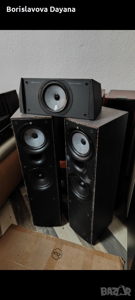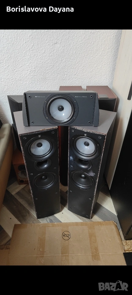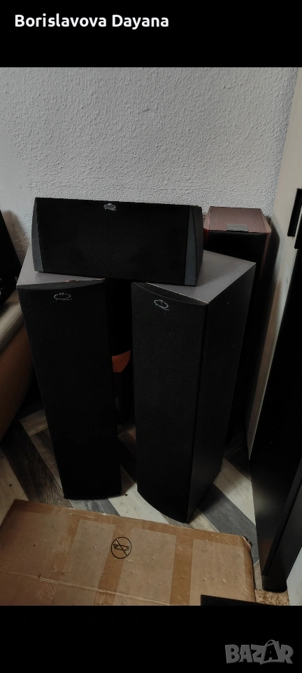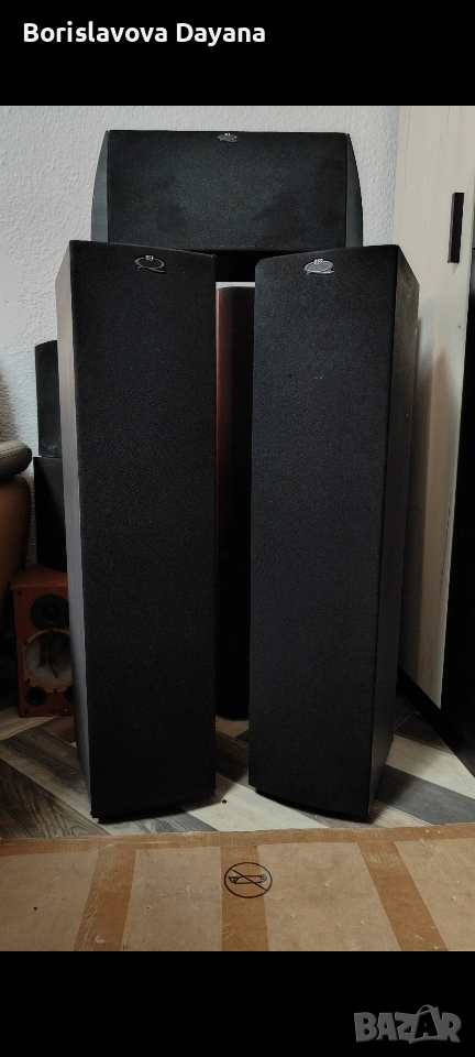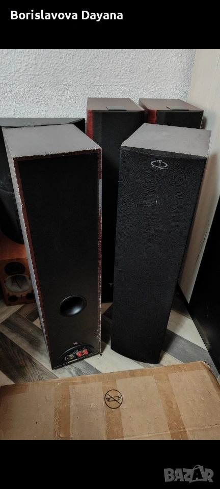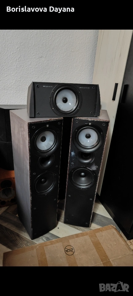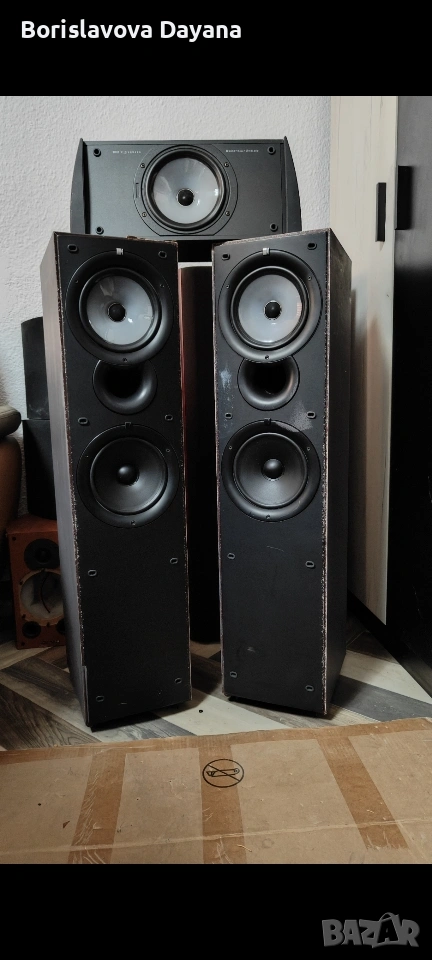 Тонколоните свирят прекрасно хубав и чист звук с много добри баси, единствените забележки са че двете тонколони имат по един дефект от транспортирането им който може да видите на последните снимки и че предишният собственик ги е боядисал в цвят който виждате на снимките централната е в оригиналният си цвят
