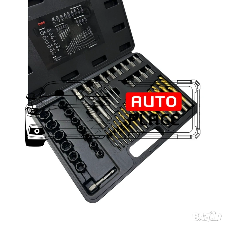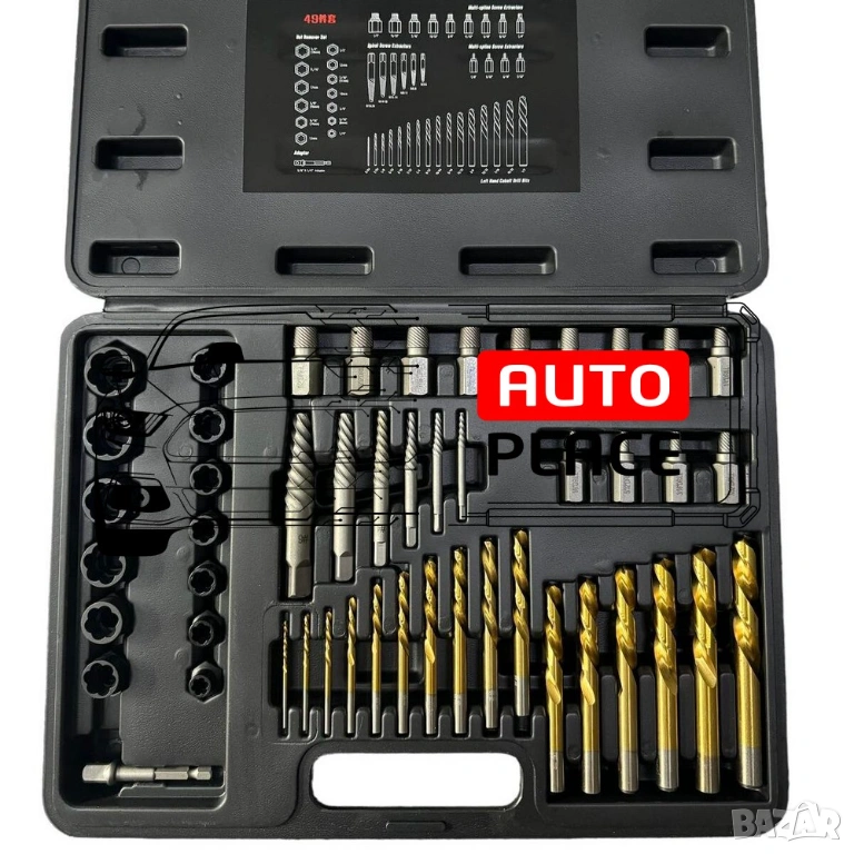 За повредени болтове шпилки, гайки от 2 до 18 мм. Общо инструменти в комплекта 49 части.