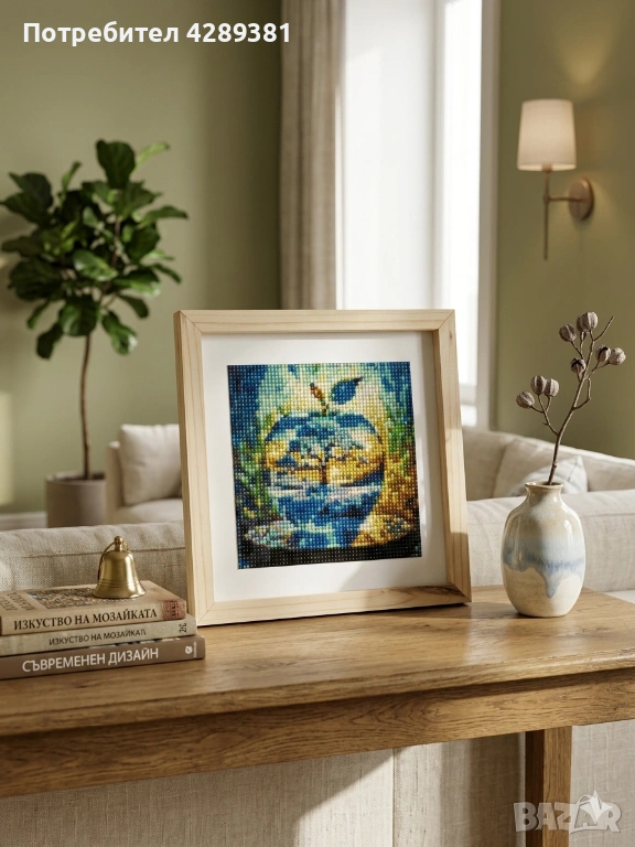 Продавам уникална картина, ръчна изработка, изпълнена с техниката „диамантена мозайка“. Това не е просто декорация, а артистично произведение, което съчетава прецизността на хиляди блестящи кристали с модерен сюрреалистичен дизайн.