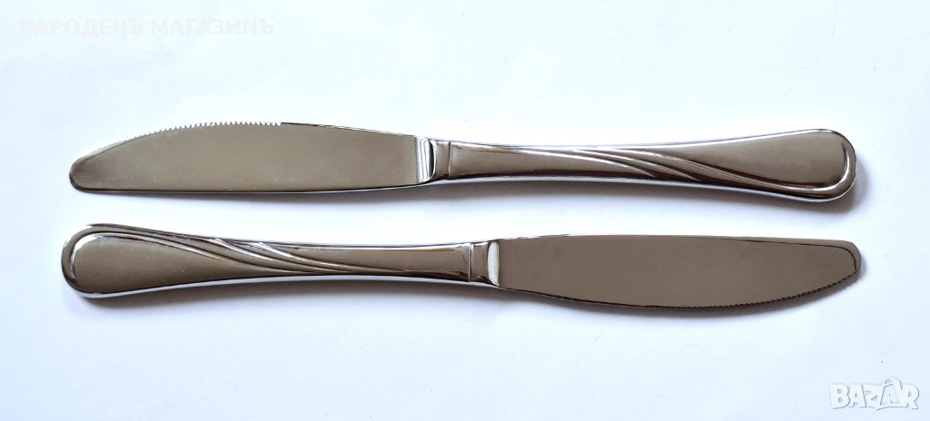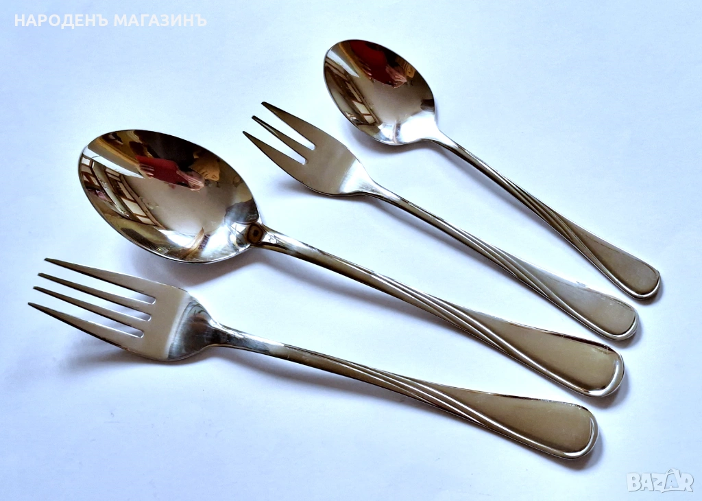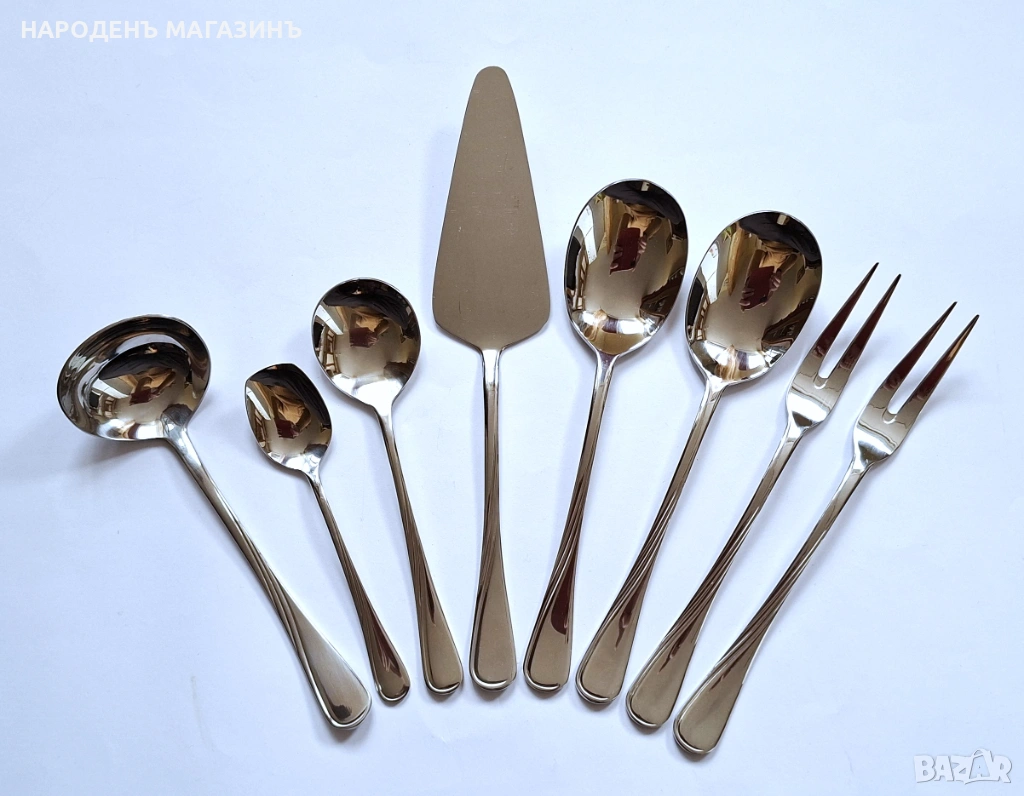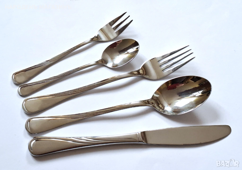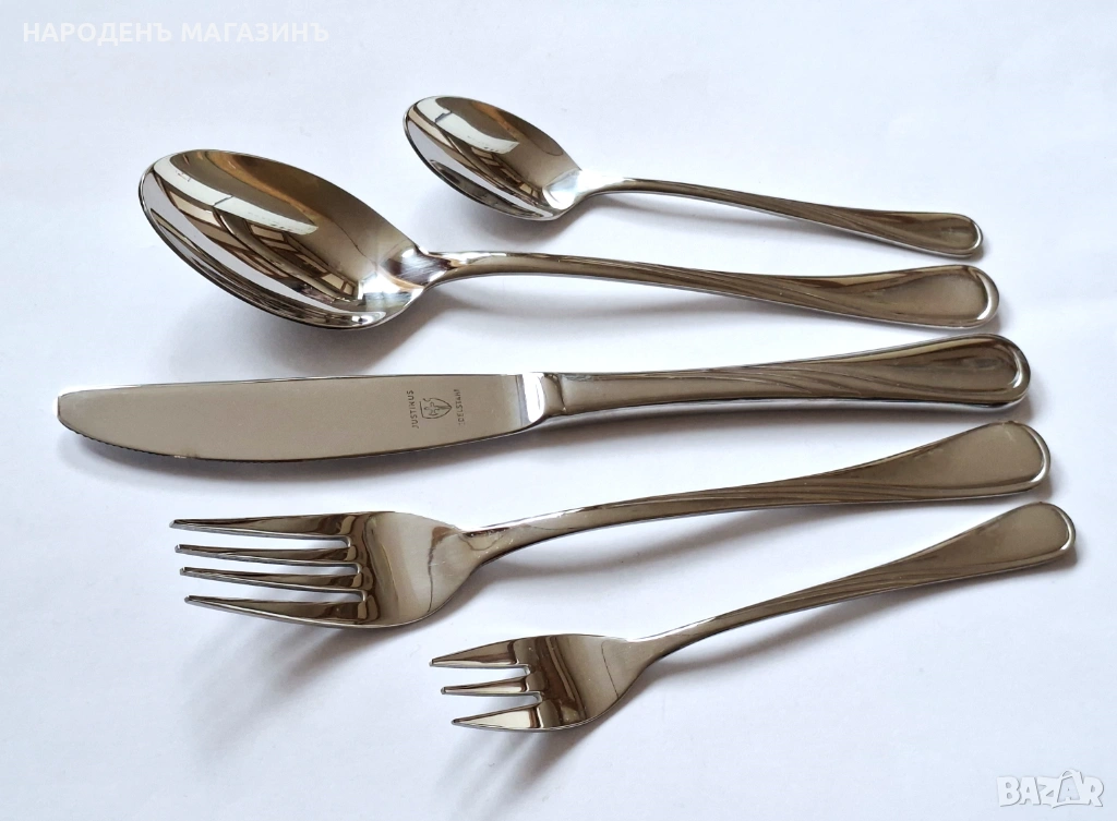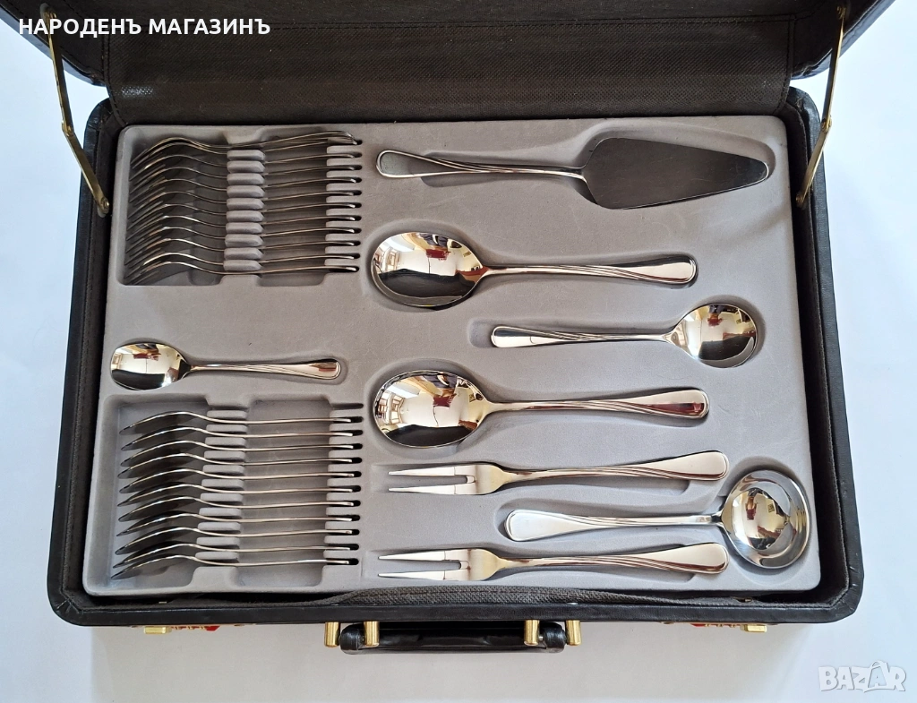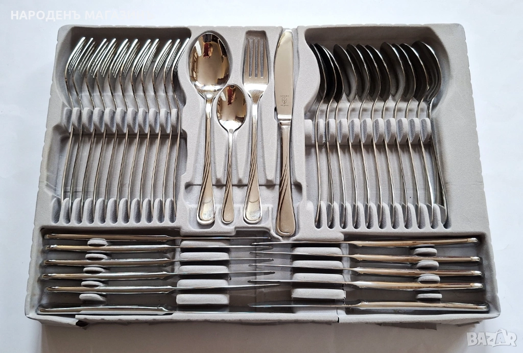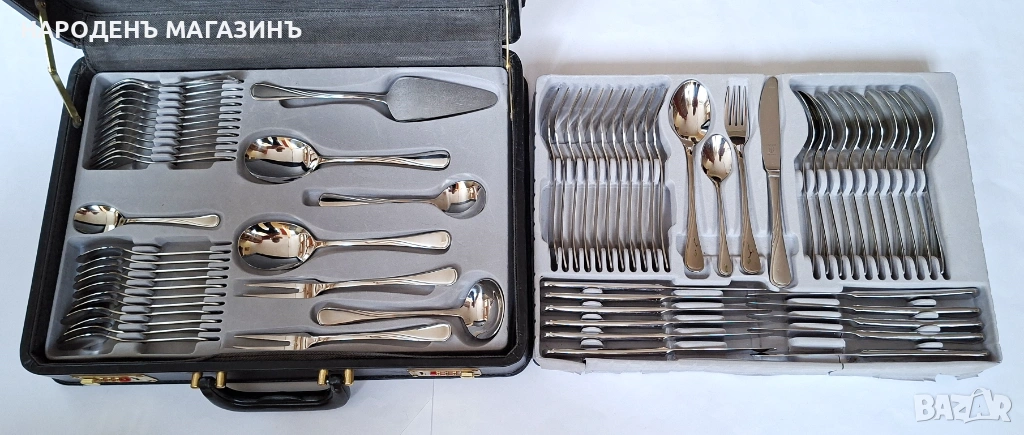 В отлично състояние, неизползвани, масивни прибори, куфар на две нива. Неръждаема стомана, без посребряване и позлата, което ги прави подходящи за съдомиялна машина. Ножовете са с назъбено острие до средата.