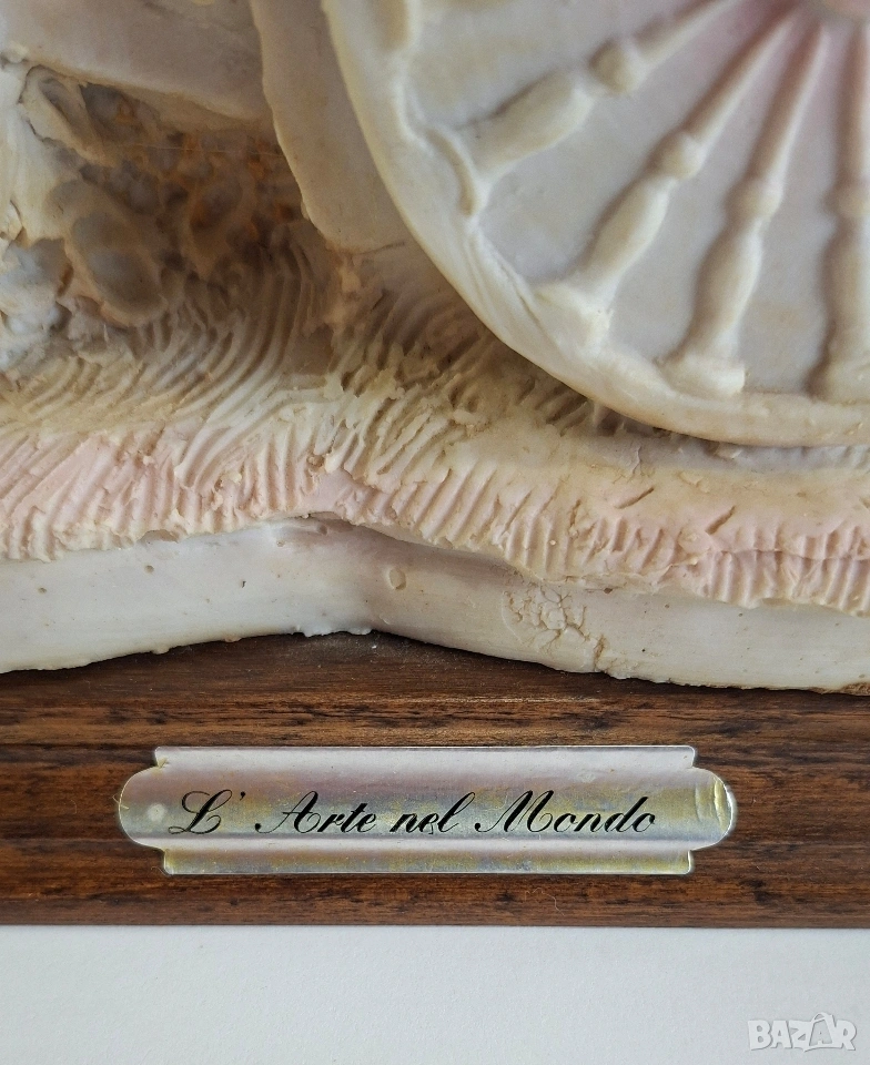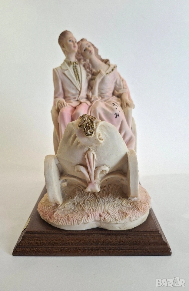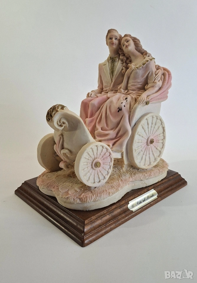 Елегантна фигура от полирезин, изобразяваща млада влюбена двойка, седяща в елегантна открита колесница. Изработена е с фин релеф, нежни пастелни тонове и детайлна изработка в артистичната поза.