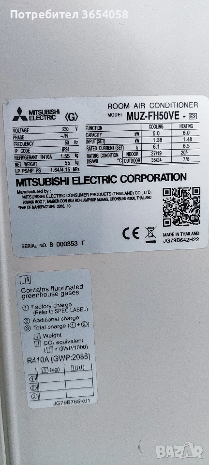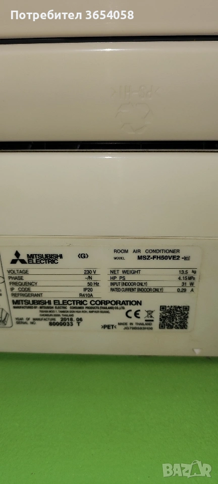 Mitsubishi Electric MSZ-FH50V E (Kirigamine) – Хиперинвертор за големи площи Продавам един от най-доказаните модели на Mitsubishi Electric – серията Deluxe FH (Kirigamine). Климатикът е изключително мощен (18 000 BTU), подходящ за отопление и охлаждане на помещения от 40 до 55 кв. м. (големи всекидневни, офиси или цели етажи). Машината е в отлично състояние, поддържана и работи безупречно. Причината за продажбата е преустройство на помещението и преминаване към подов модел. Основни характеристики и предимства: 3D i-see Sensor: Интелигентен сензор, който сканира стаята термично и насочва въздушната струя там, където е необходима, избягвайки директно духане в хората. Plasma Quad филтър: Висок клас пречистване на въздуха – неутрализира бактерии, вируси, алергени и прах. Идеален за семейства с малки деца или хора с алергии. Изключителна мощност при студ: Проектиран да работи ефективно при много ниски външни температури (до -15°C / -20°C). Двойни ламели: Позволяват независимо насочване на въздуха в две различни посоки. Хиперинверторна ефективност: Енергиен клас A++/A++, осигуряващ ниски сметки за ток при правилно оразмерено помещение. Технически данни: Мощност (Охлаждане): 5.0 kW (до 6.0 kW) Мощност (Отопление): 6.0 kW (до 8.7 kW!) Тегло на външното тяло: 55 кг (масивна машина с голям топлообменник) Хладилен агент: R410A Цена: 1950 лв. (Възможен лек коментар за сериозни купувачи на място). За справка: Цената на този модел като нов в магазините е над 3800 лв. Климатикът е все още монтиран и може да се тества на място, за да се уверите в неговата работа.