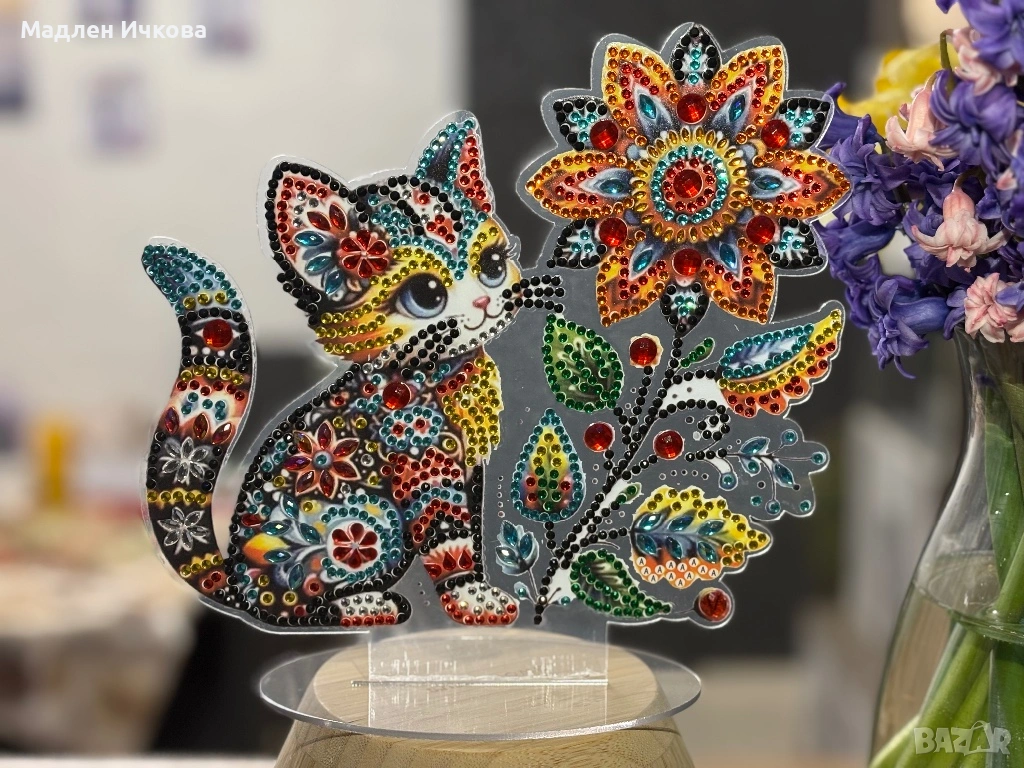 Продавам уникален, ръчно изработен диамантен гоблен с формата на приказно коте и цвете. За разлика от традиционните гоблени за стена, този модел е монтиран на стабилна прозрачна акрилна стойка, което го прави идеален за декорация на мебели.