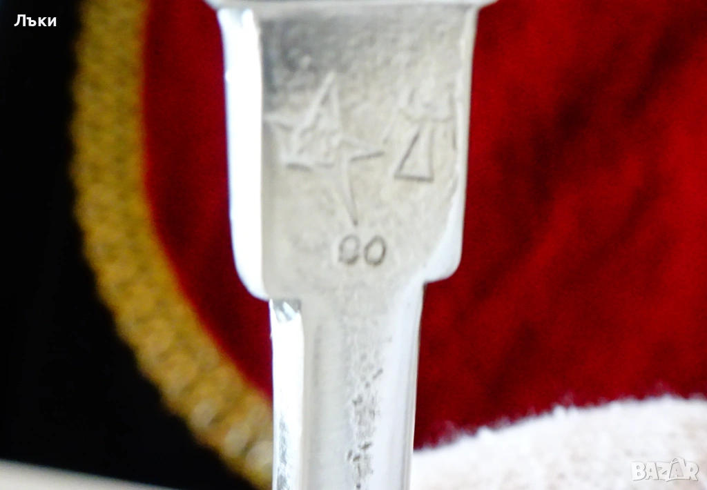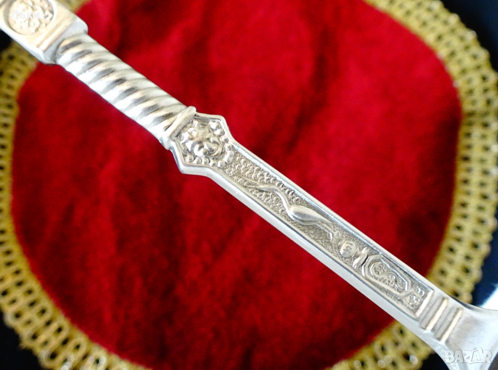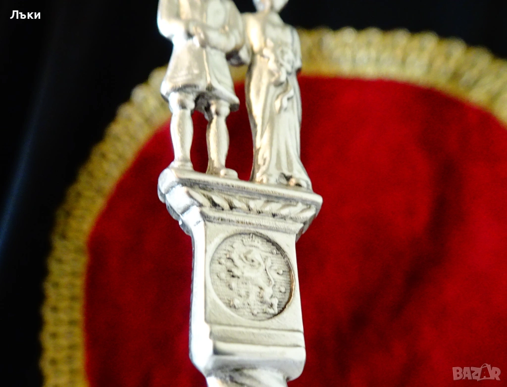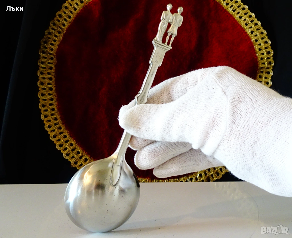 90% калай и 10% сребро,маркирана с печат от производителя.Лъжицата е декорирана