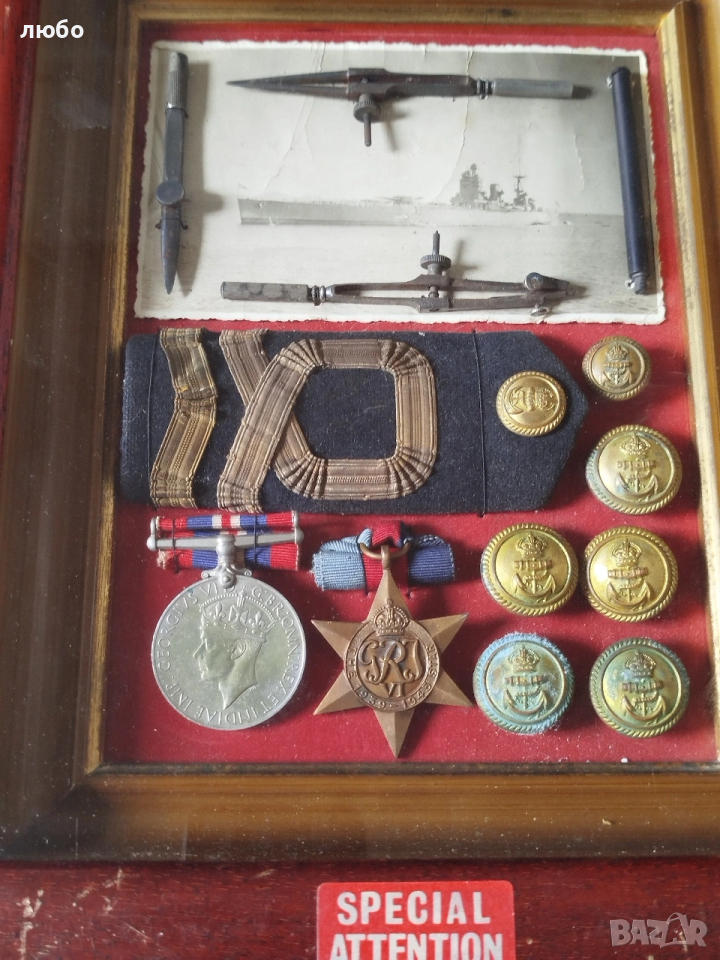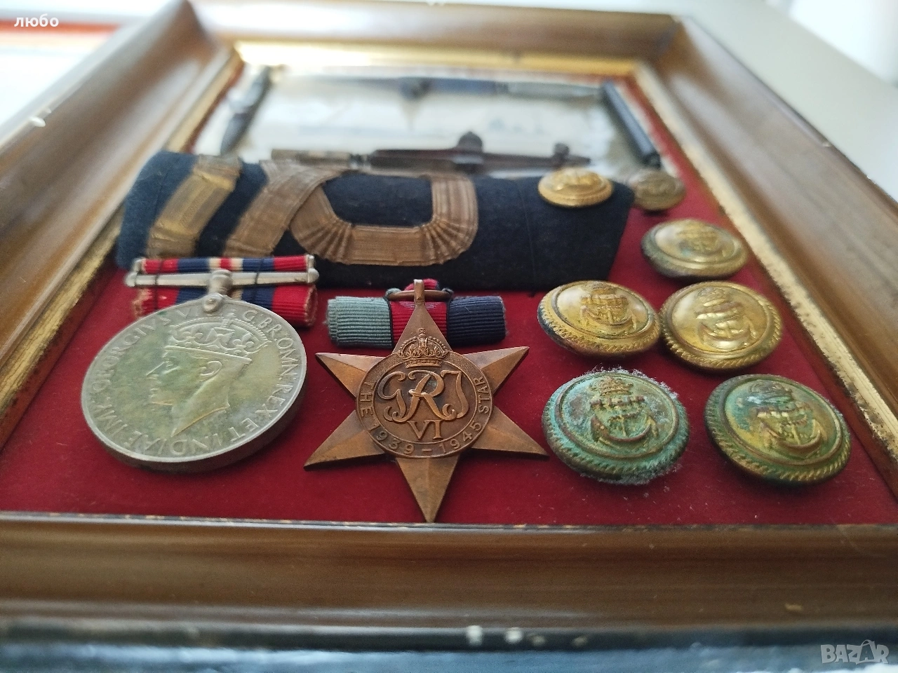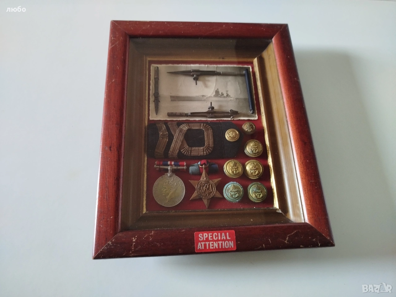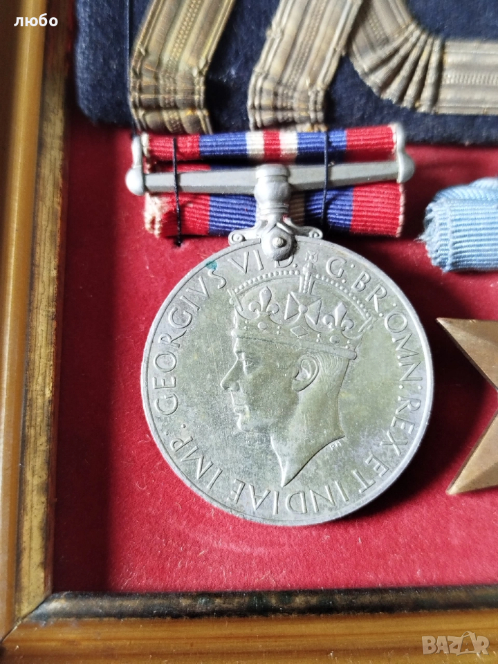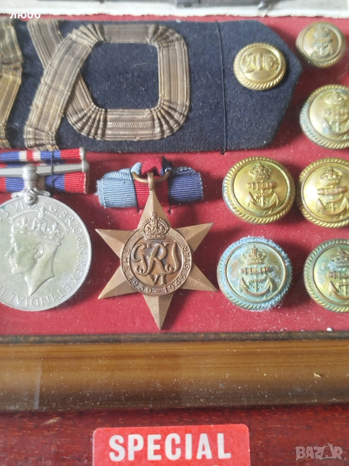Картина Музей със Британски Военни Медали и Аксесоари от Втората Световна Война 1939-1945 Включително и Военният Медал (War Medal) Учреден за Граждани Служели във Армията или Флота по-Времето на Втората Световна Война