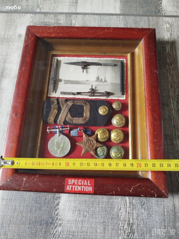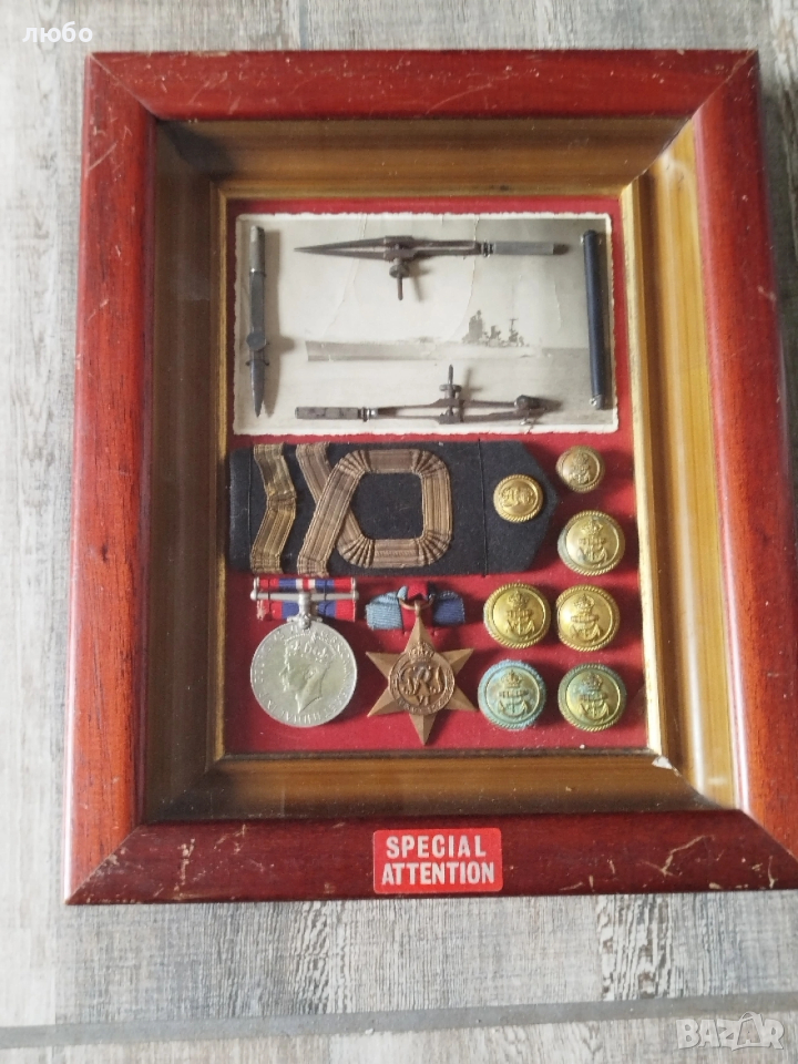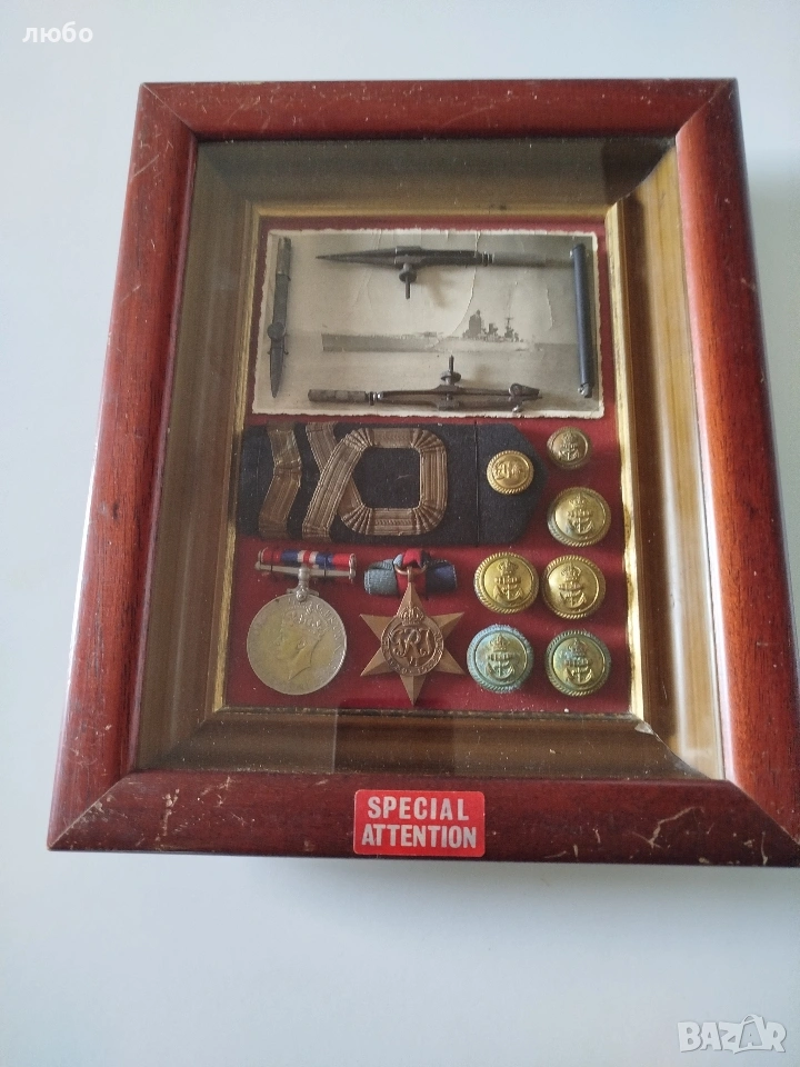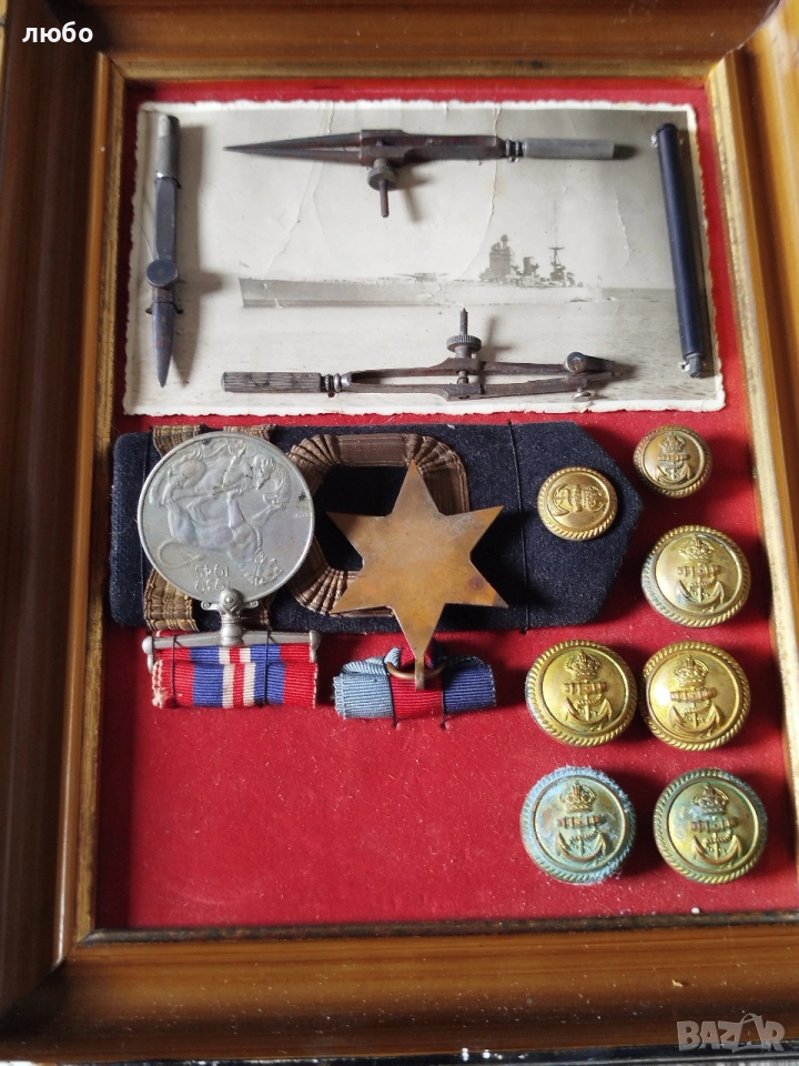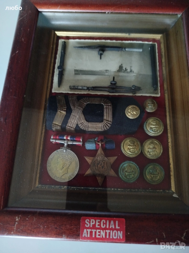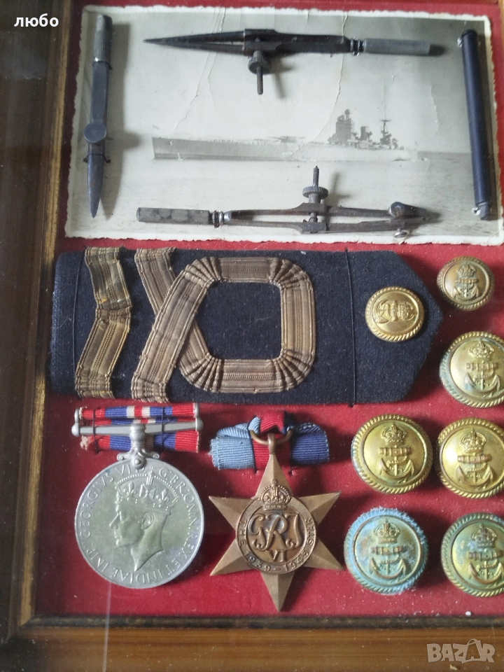 Картина Музей със Британски Военни Медали и Аксесоари от Втората Световна Война 1939-1945 Включително и Военният Медал (War Medal) Учреден за Граждани Служели във Армията или Флота по-Времето на Втората Световна Война
