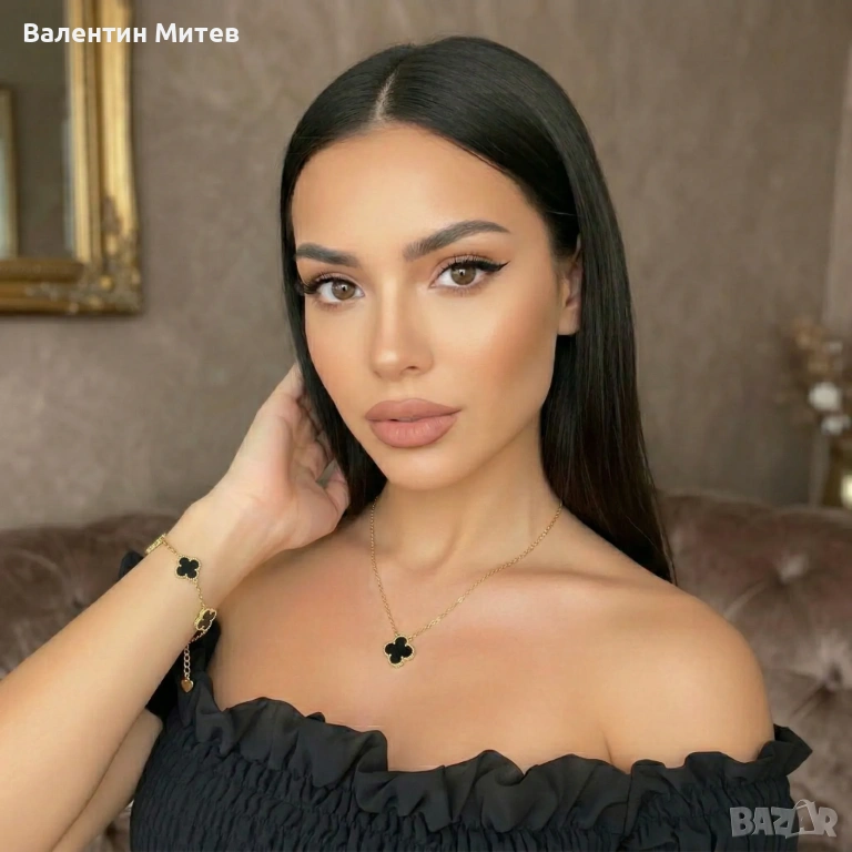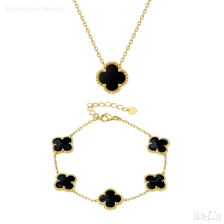 Елегантният комплект „Виктория“ е изработен от сребро 925 с 18К златно покритие и черен оникс, вдъхновен от силната символика на четирилистната детелина - късмет, защита и вътрешен баланс. Дълбокият тъмен блясък на оникса придава характер и усещане за сила, а изчистеният дизайн носи женственост и стил. Комплектът създава усещане за личен амулет и пристига в подаръчна кутия с послание.