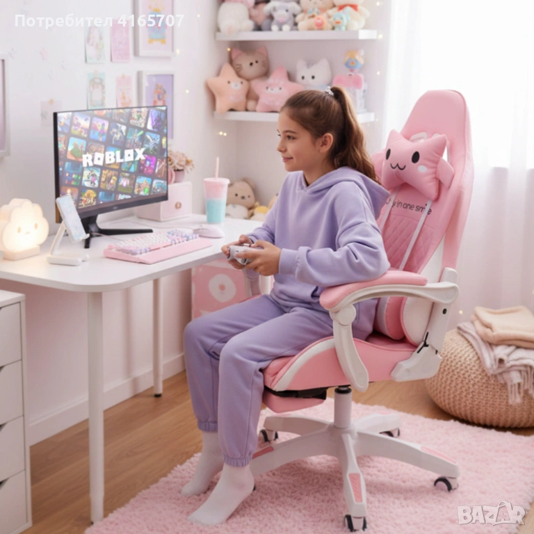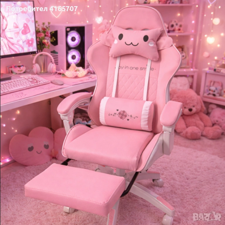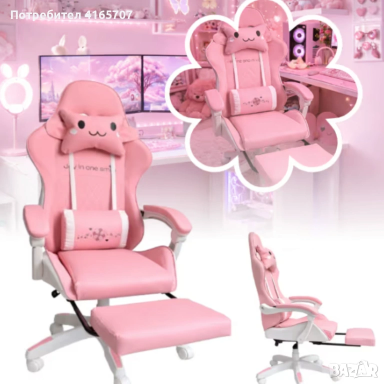 Ергономичен розов геймърски стол с поставка за крака - регулируема облегалка и 2 възглавници за пове → Обява 53966402