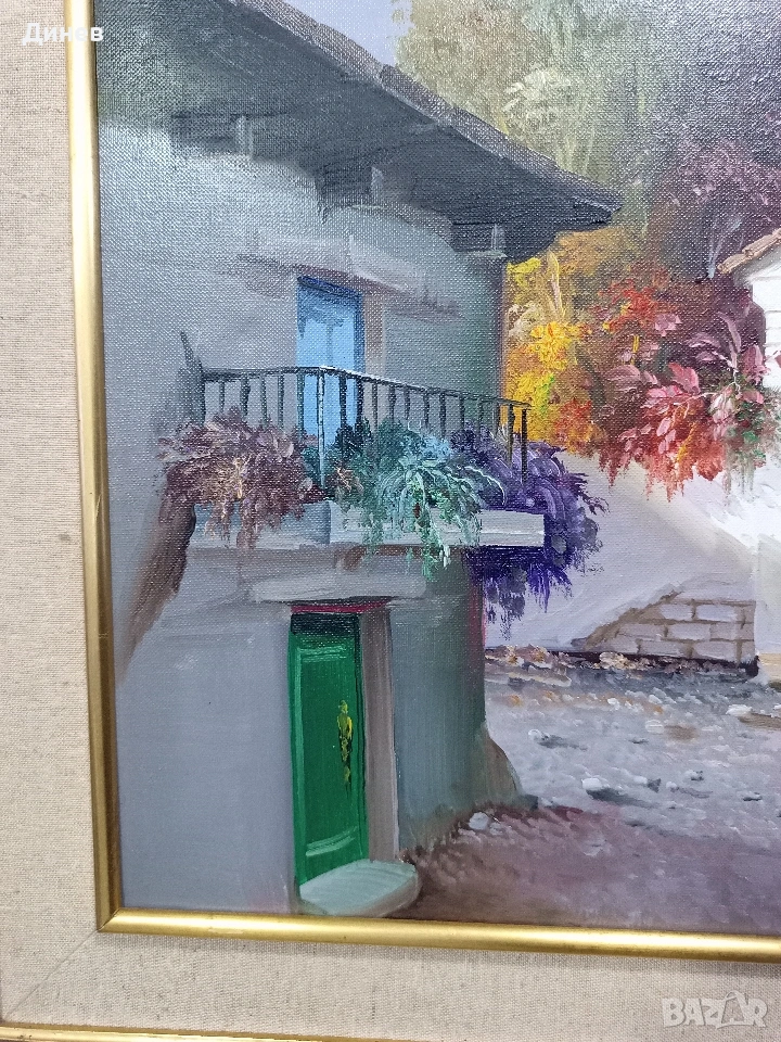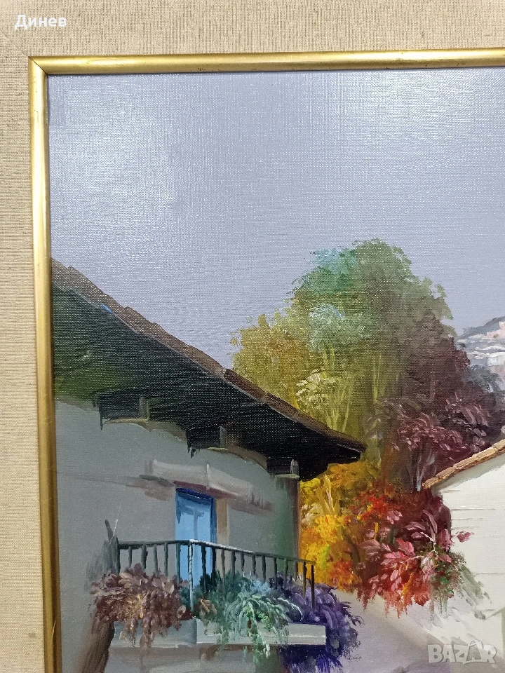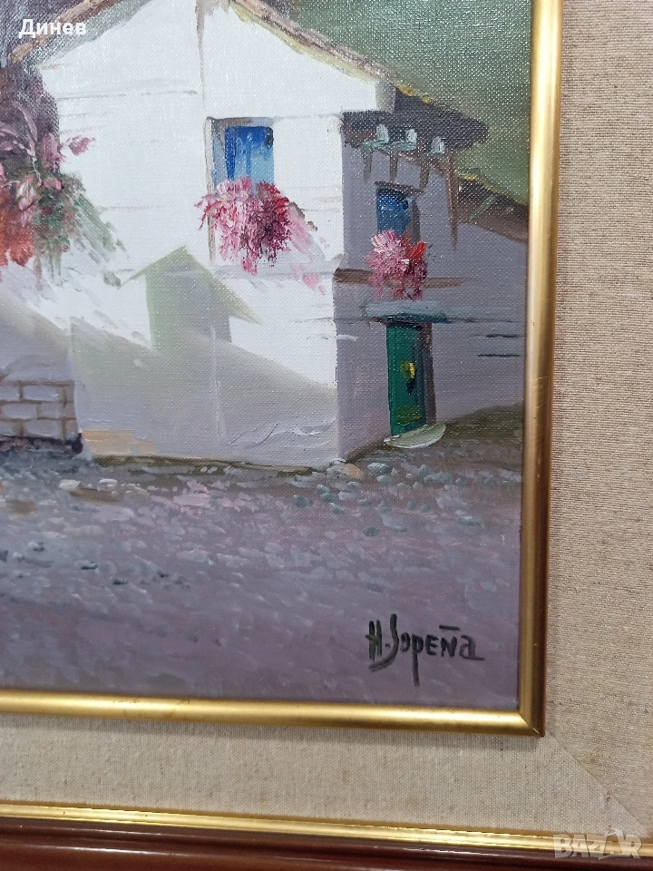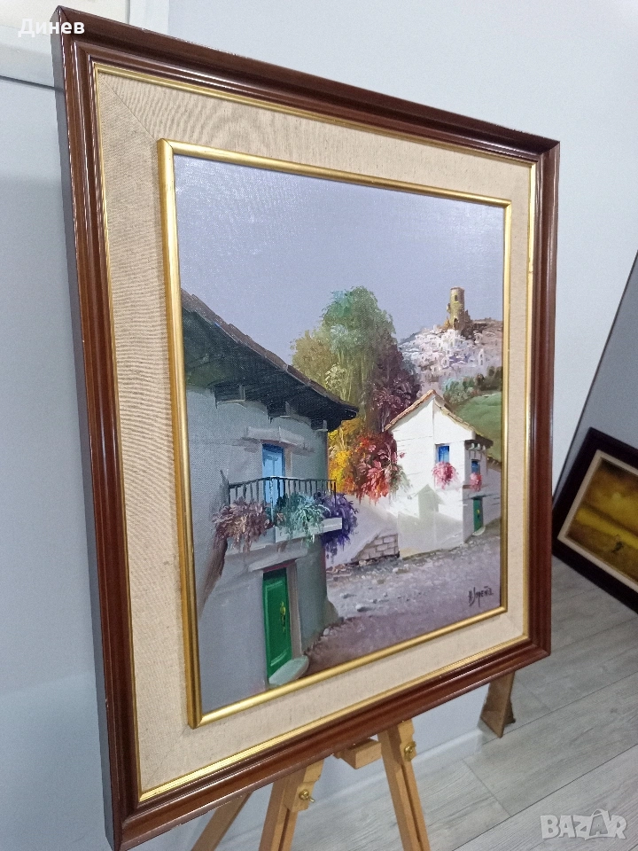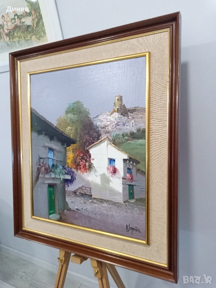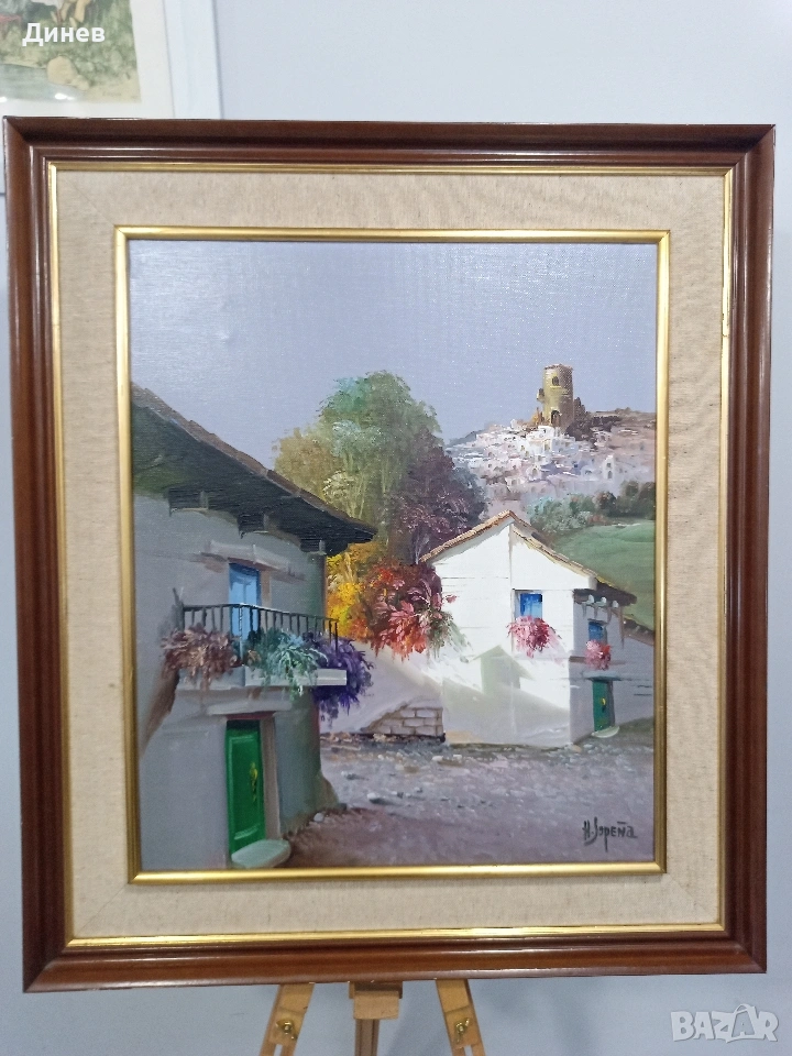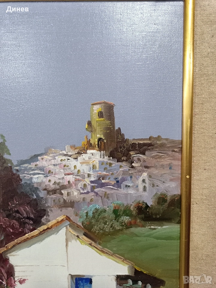 Предлагам на Вашето внимание изключително свежа и лъчезарна маслена картина, пренасяща духа на слънчева Андалусия директно във Вашия дом. Творбата е перфектен акцент за интериор, който се нуждае от светлина, цвят и средиземноморски уют. Основни характеристики: Произход: Автентична испанска творба с оригинален печат на подрамката "OLIMPIA MALAGA", гарантиращ нейния географски произход. Автор: Картината е лично подписана от художника H. Sopeña. Сюжет: Класическа испанска архитектура с бели фасади, контрастиращи на фона на пищна растителност и ярки цветя по балконите. В далечината се вижда историческа кула, характерна за региона на Малага. Техника: Маслени бои върху платно с изразителни мазки и отлично уловена южна светлина. Размери: 65 x 74 см (с рамката) – балансиран размер, подходящ за всяка стена. Рамка: Качествена дървена рамка с вътрешен ленен борд и златист кант, която завършва елегантното излъчване на картината с леки следи от времето. Защо тази картина е ценна? Доказан произход: Печатът от Малага е рядък маркер, който вдига стойността и доверието в предмета. Естетика и настроение: Импресионистичният стил и топлите цветове създават усещане за вечно лято. Готова за подарък или декорация: Много добро състояние на платното , без нужда от допълнителни инвестиции. Изпращам по куриер с преглед за да се уверите какво купувате