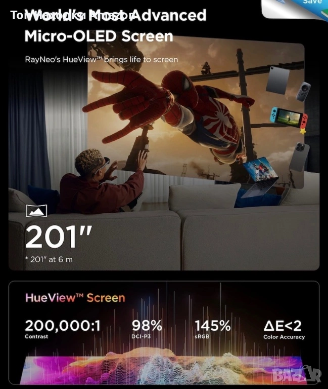 • RayNeo Air 3S използва революционния HueView™ micro-OLED дисплей, който предлага до 98% покритие на DCI-P3 гамата, което води до невероятно широка и реалистична цветова гама. С точност на цветовете ΔE < 2, всеки нюанс се възпроизвежда вярно