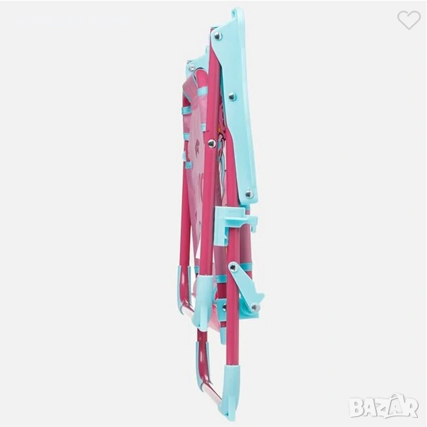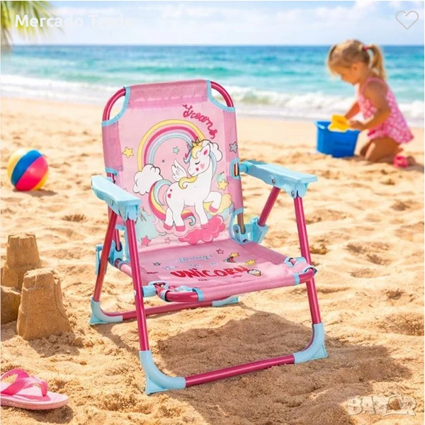 Сгъваемо столче за момиче с метална рамка, в розов цвят с тюркоазени дръжки и детайли и плат с щампа еднорог. Това е сгъваемо столче, подходящо и за градината и балкона, и може лесно да се използва като детски стол за море и плаж, тъй като се пренася лесно.