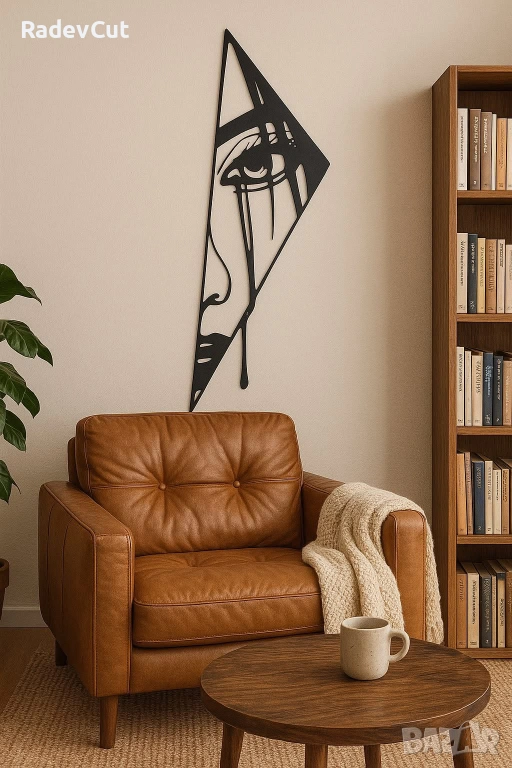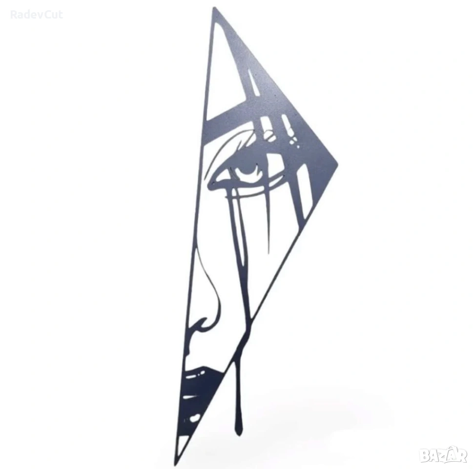 Впечатляваща и модерна метална декорация, която съчетава абстрактната геометрия с емоционалната сила на изкуството. Стилно изрязаният силует на лице с течящи сълзи, заключен в триъгълна форма, придава дълбочина, мистерия и артистичност на всяко пространство.