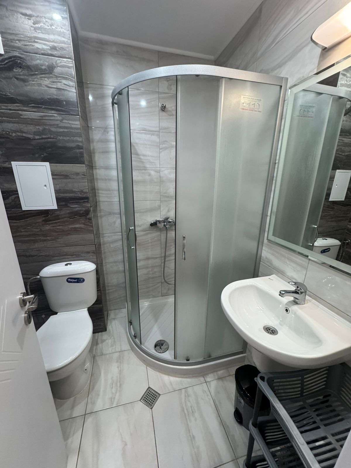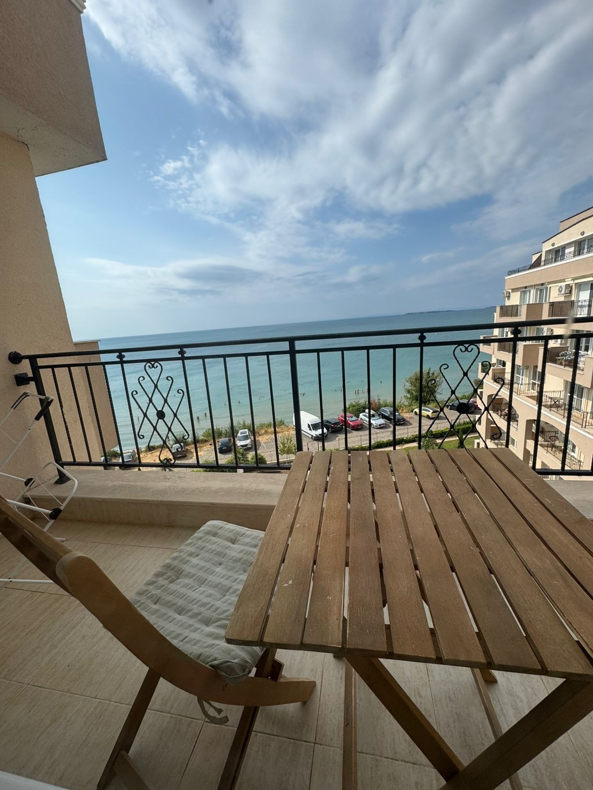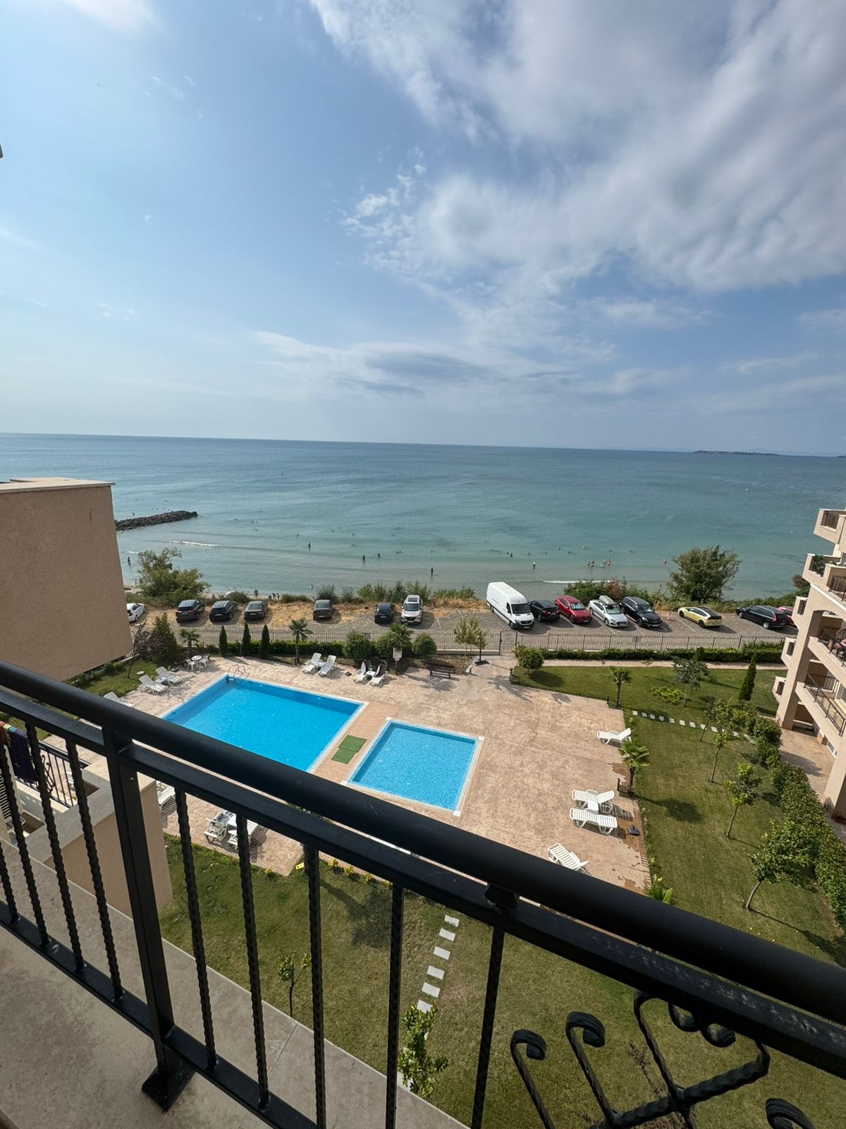 Апартаментът е разположен на пети етаж, с обща площ от 58 кв.м., и се предлага в отлично състояние стилно обзаведен и напълно оборудван. Разпределението включва входно антре, светла всекидневна с кухненски бокс, уютна спалня, баня с тоалетна и душ кабина, както и тераса с панорамна гледка към морето и вътрешния басейн на комплекса.