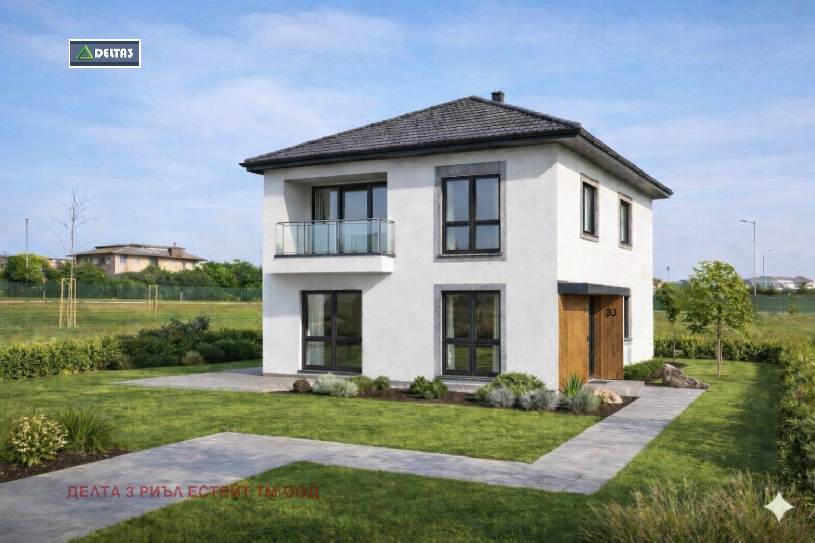 Фасада: висококачествена мазилка с декоративни дървесни елементи и стъклени парапети