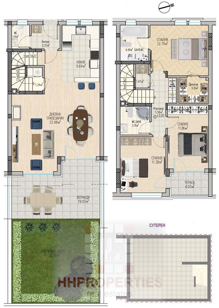 Външни пространства: Елегантна веранда и частен двор с озеленени площи, където можете да създадете зона за отдих, барбекю или трапезария на открито.