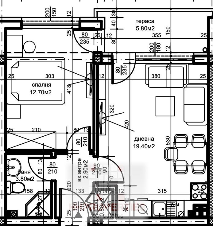 Апартаментът чиста жилищна площ от 51,8 кв.м. разпределени между комфортна дневна с кухненска част, спалня, баня с тоалетна, склад и тераса.