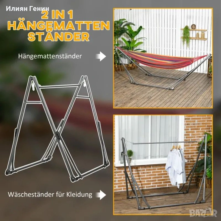 Стойка за хамак 2 в 1: Тази преносима стойка за хамак, с уникалния си, модерен дизайн, лесно се трансформира от стойка за хамак в сушилник за дрехи. Тя предлага перфектната естетика за вашето външно пространство.