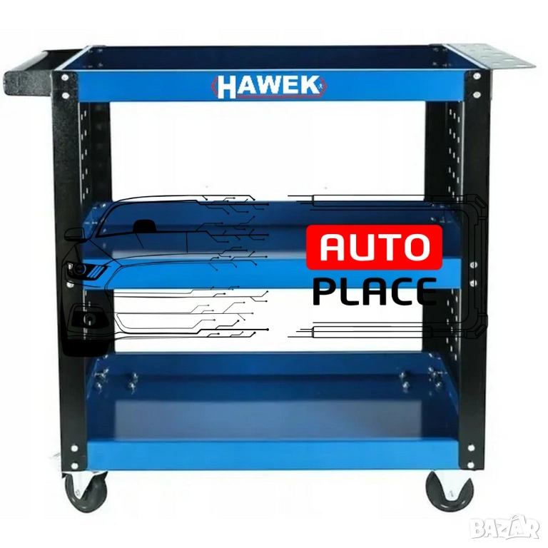 Мобилна количка за инструменти HAWEK HW-1177 е с товароносимост 136 кг и три рафта за съхранение. Може да се бута лесно напред благодарение на интегрираната дръжка. Количката за инструменти е с ширина 76 см, височина 78 см и дълбочина 36 см. Оборудвана е с четири колела с лагери, две от които въртящи се и едно оборудвано със спирачка.