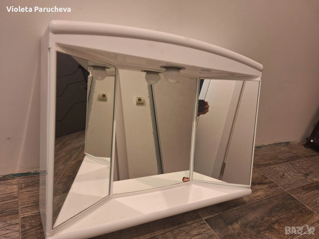 Компактен PVC шкаф за баня с размери 59 см ширина и 45 см височина. Подходящ за монтаж в малки бани и тоалетни. Има осветление.