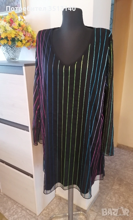Туника от шифон с подплата и тънки блестящи различни цветове ивици. Размерът е 54 европейски, 5XL или 60 български. Туниката е нова, не е обличана, но няма етикет