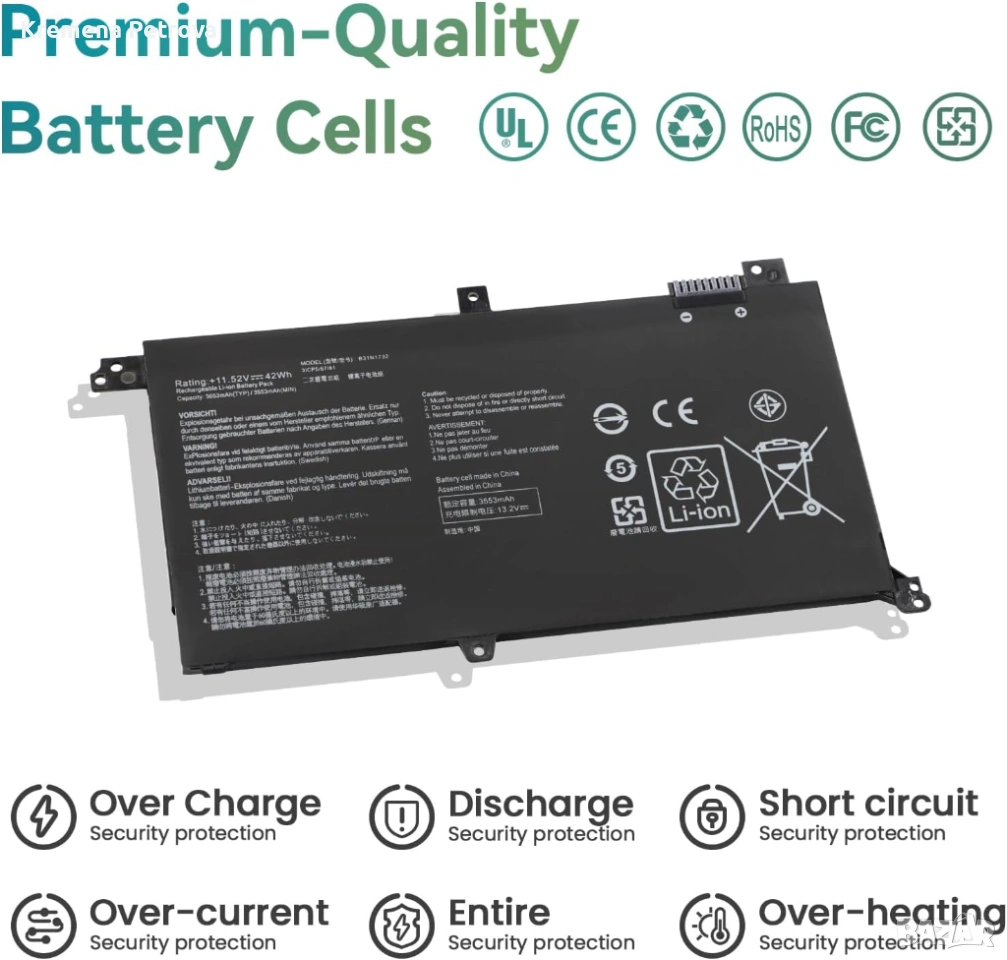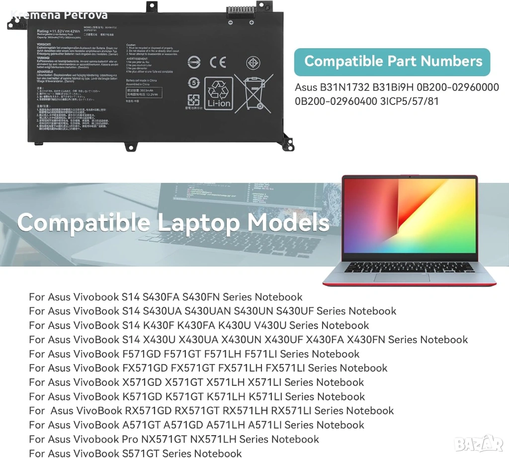 【Съвместим номер на част】Заместител на батерия за лаптоп Asus B31N1732 B31Bi9H 0B200-02960000 0B200-02960400 3ICP5/57/81.【Съвместими модели лаптопи】Съвместим с Asus Vivobook S14 S430FA S430FN S430UA S430UAN S430UN S430UF K430F K430FA K430U V430U X430U X430UA X430UN X430UF X430FA X430FN F571GD F571GT F571LH F571LI FX571GD FX571GT FX571LH FX571LI X571GD X571GT X571LH X571LI K571GD K571GT K571LH K571LI RX571GD RX571GT RX571LH RX571LI A571GT A571GD A571LH A571LI S571GT Батерия за лаптоп NX571GT NX571LH серия.
