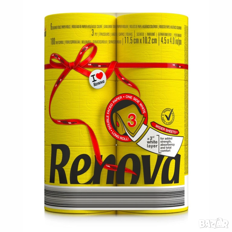 Renova Yellow е иновативна 3-пластова тоалетна хартия, която съчетава естетика и функционалност. С по-широки от стандартните листа и специална технология на пластовете, тя предлага изключителна мекота и здравина. Продуктът е тестван под дерматологичен и гинекологичен контрол, което го прави напълно безопасен. Идеална за тези, които искат да избягат от стандартното бяло и да добавят свеж, слънчев елемент в своя дом или офис