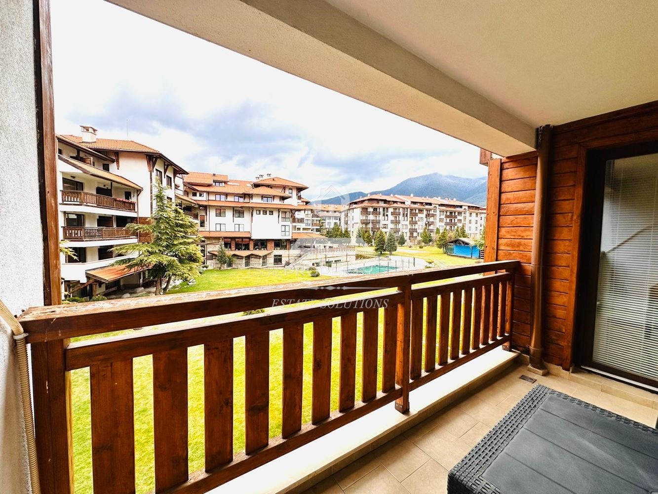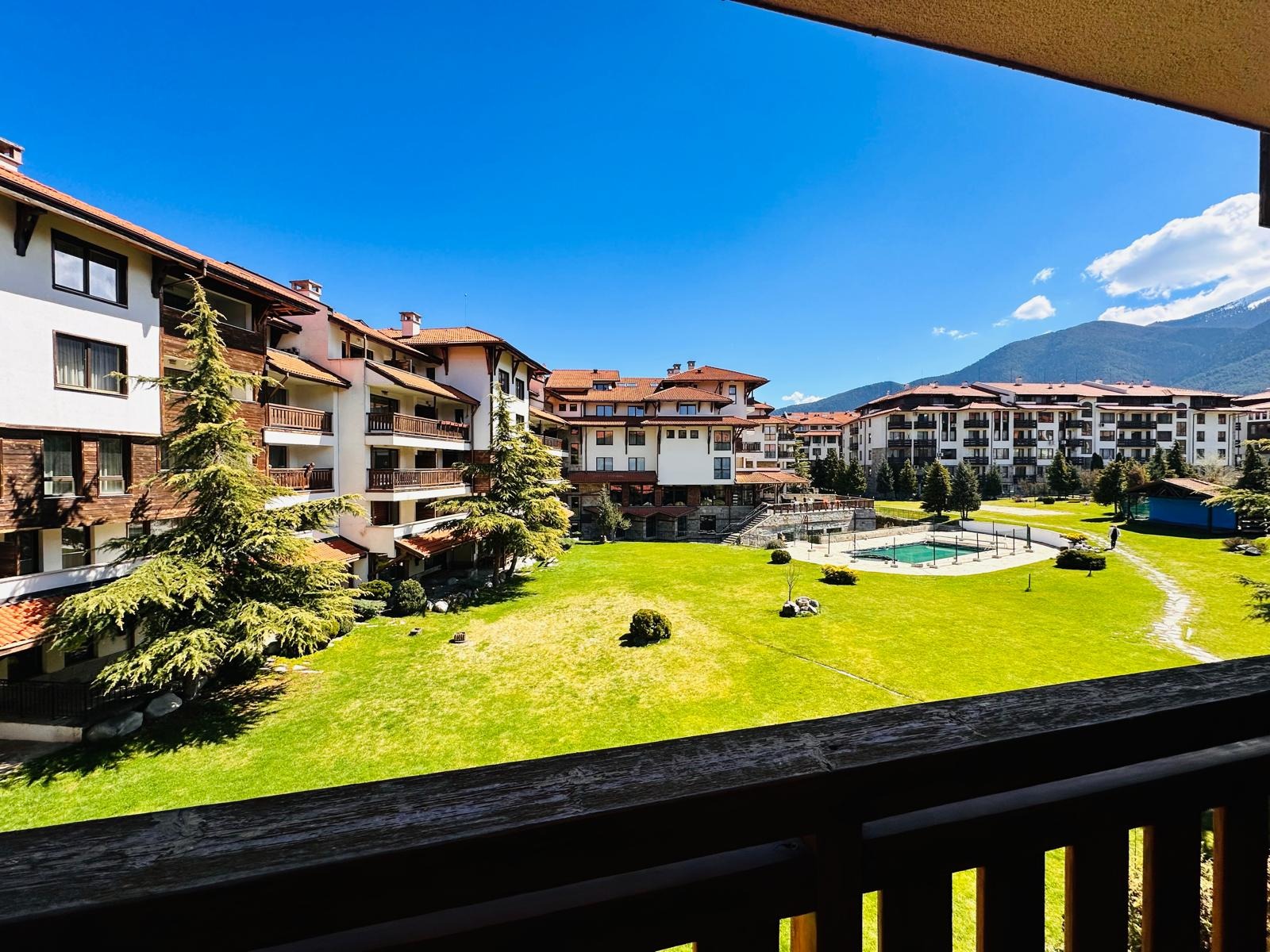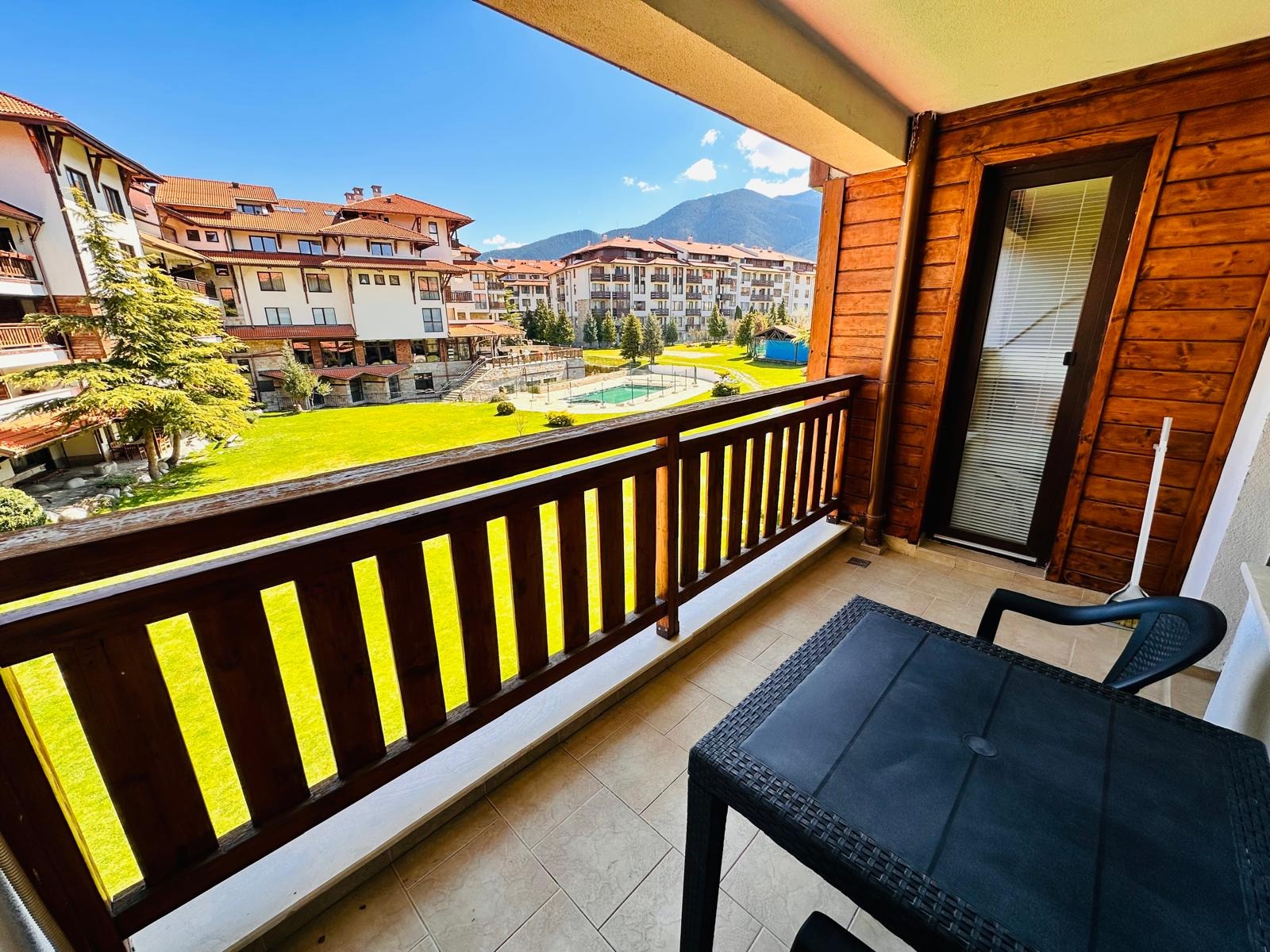 Комплекс 'BANSKO ROYAL TOWERS'' разполага с огромен двор с великолепна гледка към планината, открит басейн, волейболно игрище, детски кът с люлки и пързалка. Ползват се безплатно от собствениците на Апартамента.
