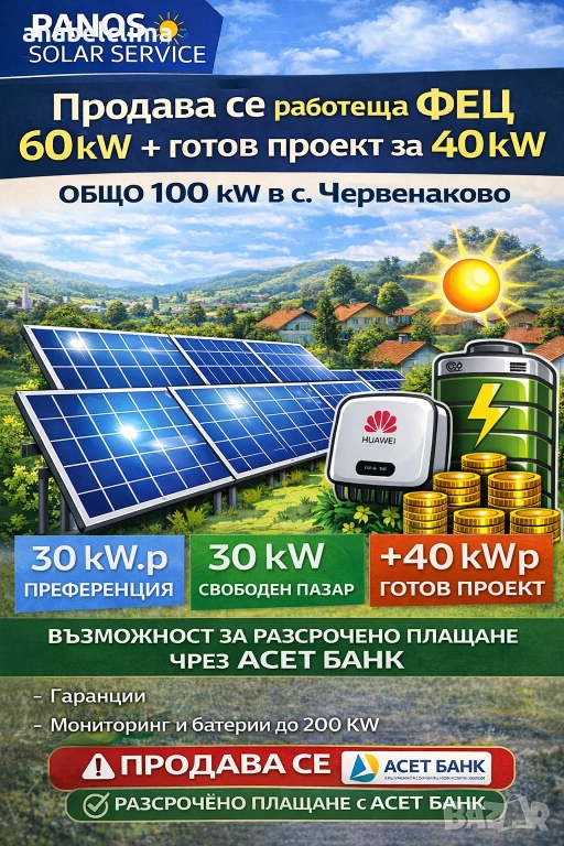 Продаваме две работещи фотоволтаични централи по 30 kW всяка плюс готов проект за изграждане 40 kW, разположени в с. Червенаково, общ. Твърдица.
