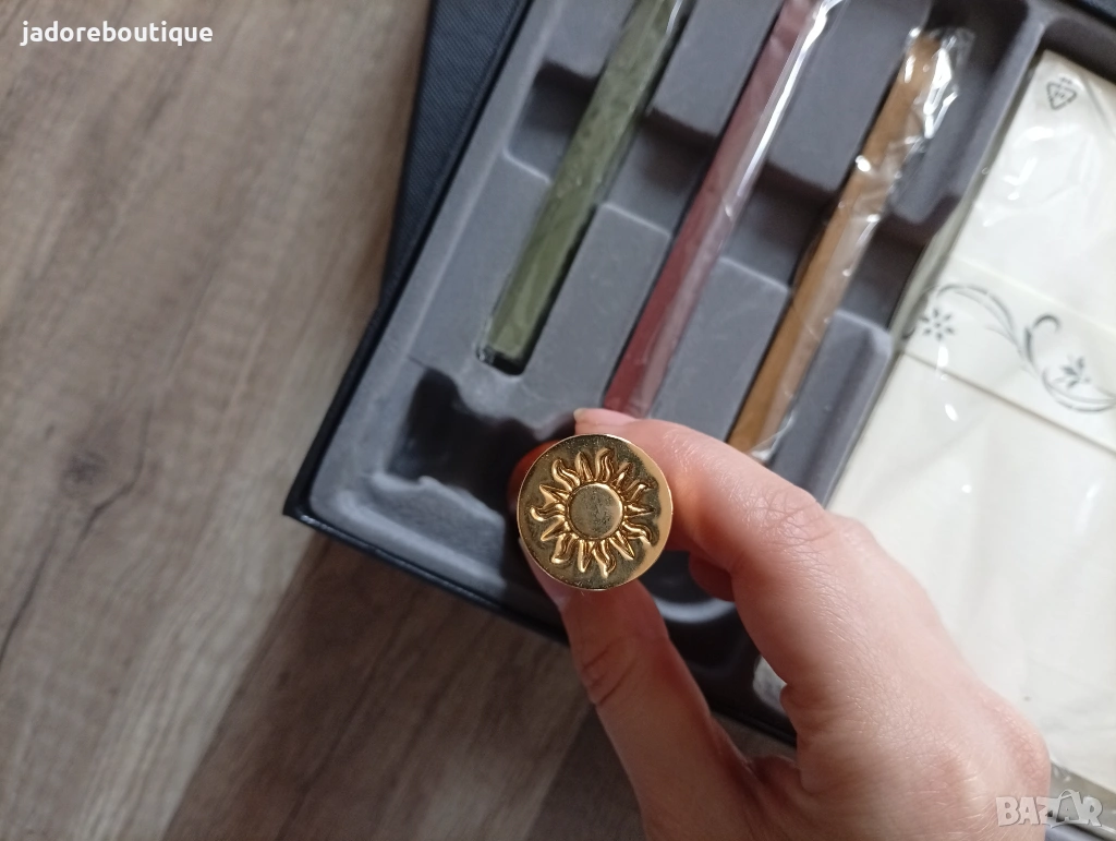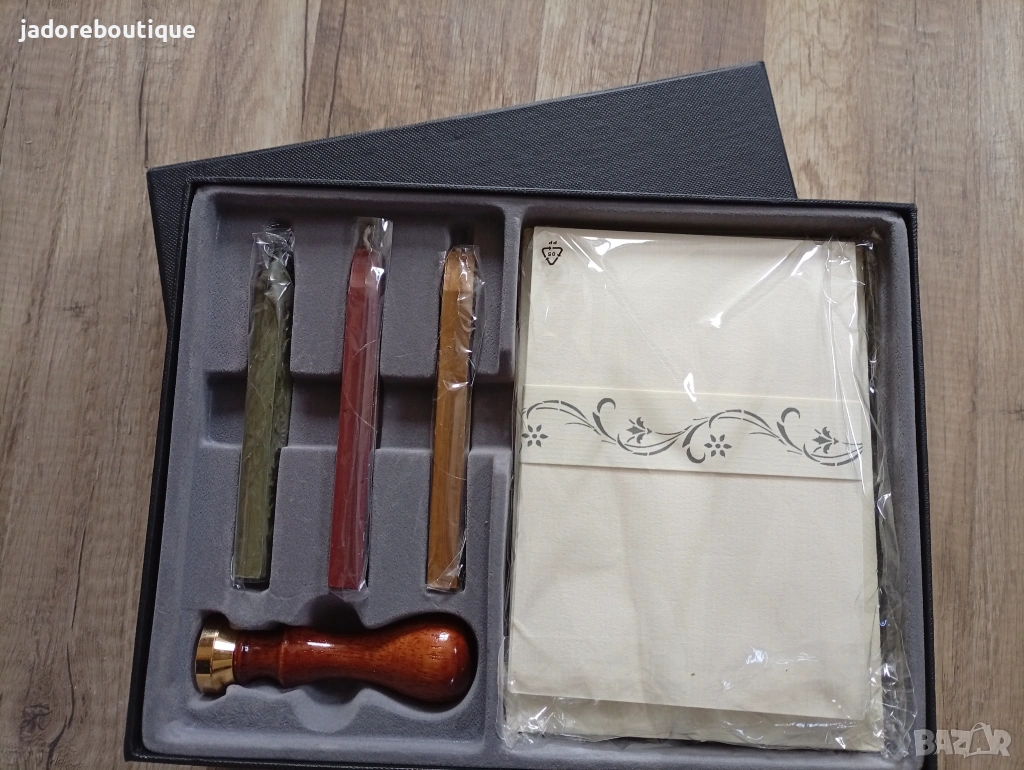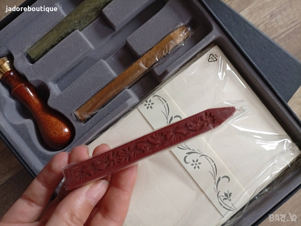Комплектът включва дървена дръжка, 1 брой метално клише, 3 броя восъчни пръчки различни цветове, 9 броя картички и 9 броя пликове.