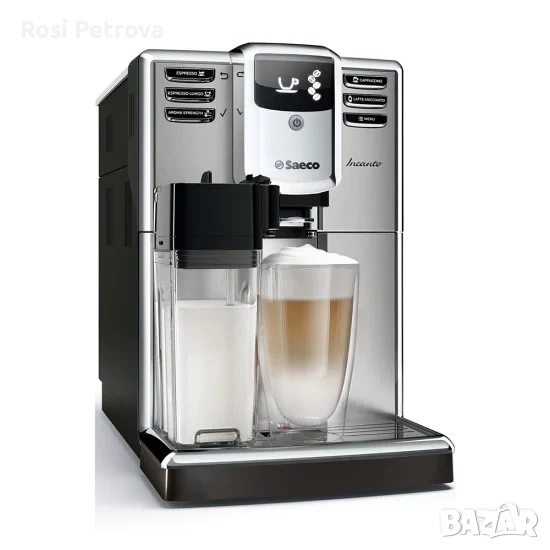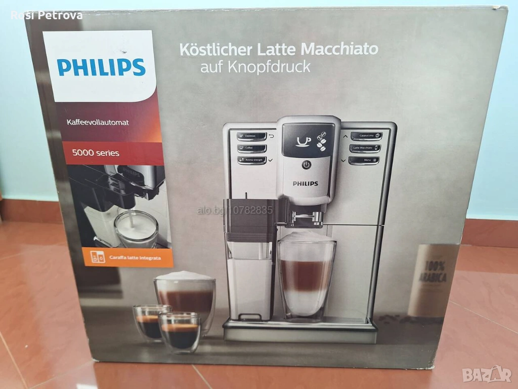 Кафе автомат Philips Saeco 5000 серия, Автоматичната машина за еспресо има мощност от 1850W и налягане от 15 бара, с които приготвянето на всяка чаша кафе отнема само минута. Приготвя 10бр. напитки, като еспресо, капучино, лате с директен избор на класическо еспресо кафе или рецепти с мляко. Персонализира кафето, като настройва индивидуалната дължина, сила, вкус, температура и аромат на всяка чаша. Има 100% керамична мелачка за кафе на зърна, може да работи и със смляно кафе в отделен контейнер, има аква воден филтър, избор на сила и дължина на кафе и мляко, отлично състояние, превъзходни напитки. Отлично решение за всеки дом или офис.