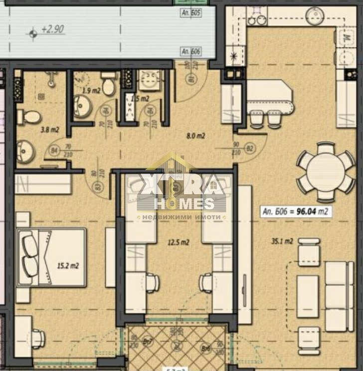 Към апартамента има просторна тераса, до която се излиза от трите основни помещения дневната и двете спални, което осигурява допълнителен комфорт и светлина.