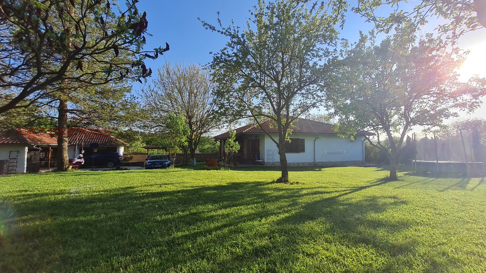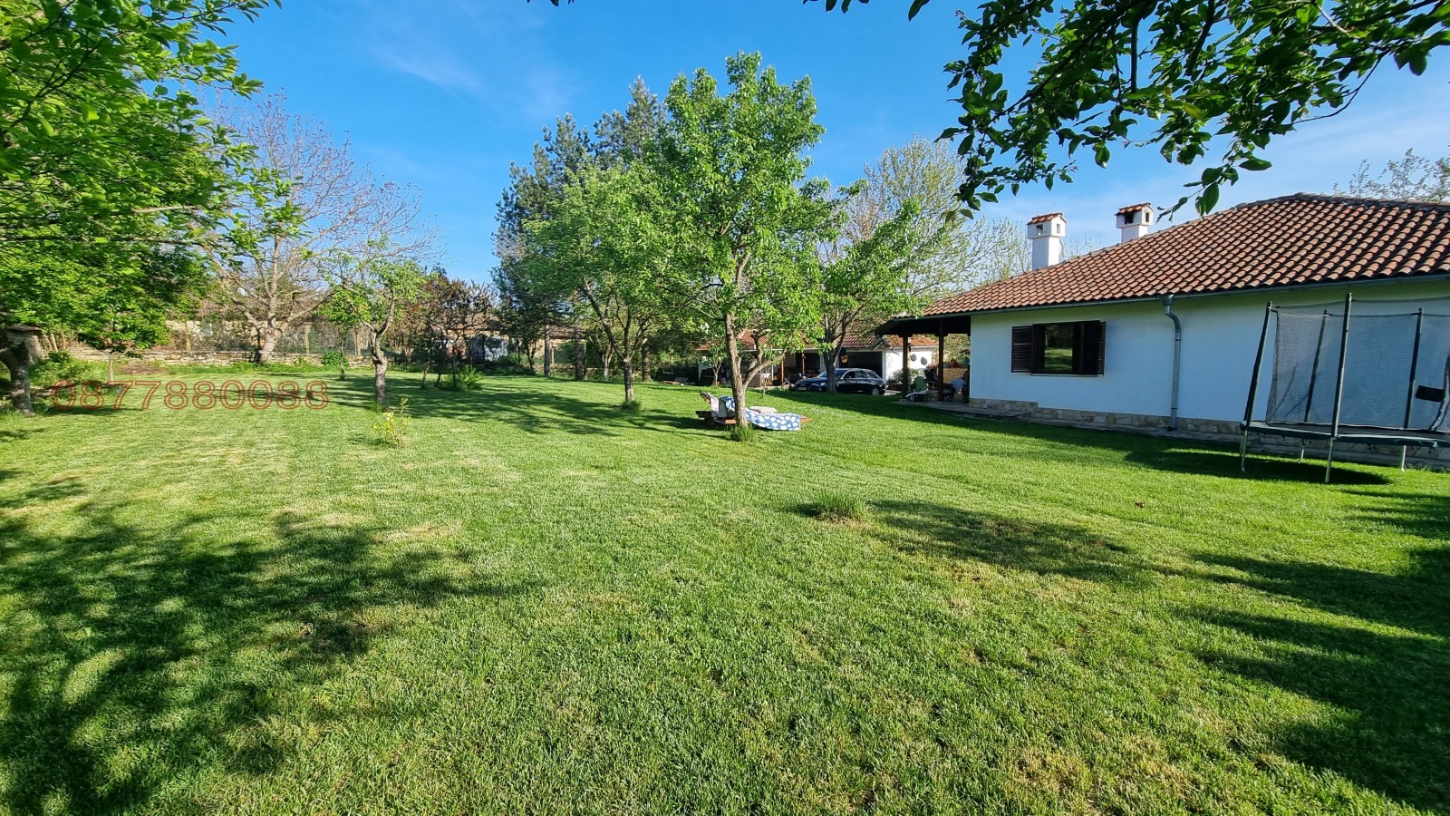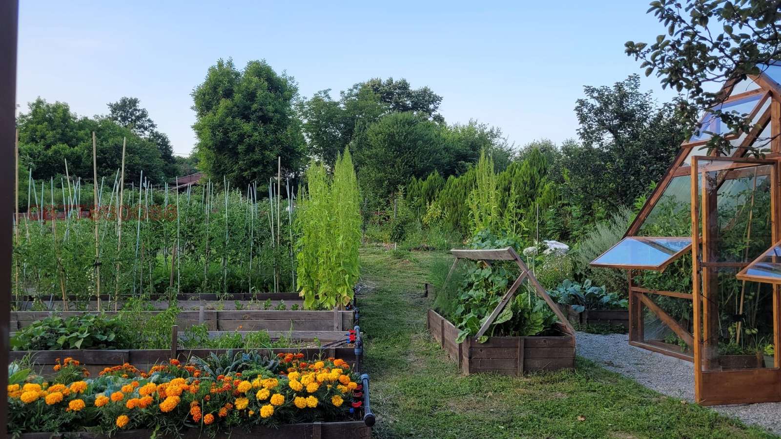 Огромен 2000 кв.м. двор с десетки дръвчета и жив плет. Автоматизирано напояване. Биологично чиста градина с повдигнати лехи, овошки, автоматизирана система напояване, къщичка, дървено-стъклена оранжерия;