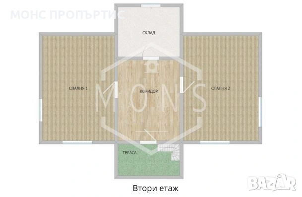Първи етаж: коридор, две спални, склад и тераса.