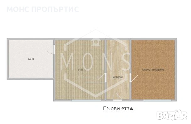 Втори етаж: коридор, стая, баня и избено помещение.