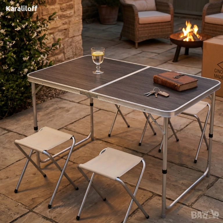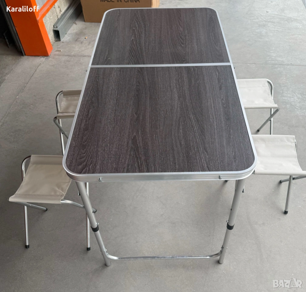 Комплект сгъваема къмпинг маса с 4 стола, регулируема височина, дизайн "куфар" в сив цвят → Обява 53970728