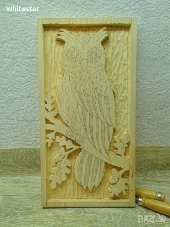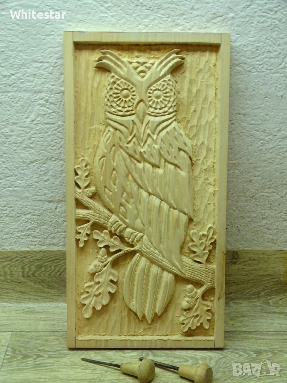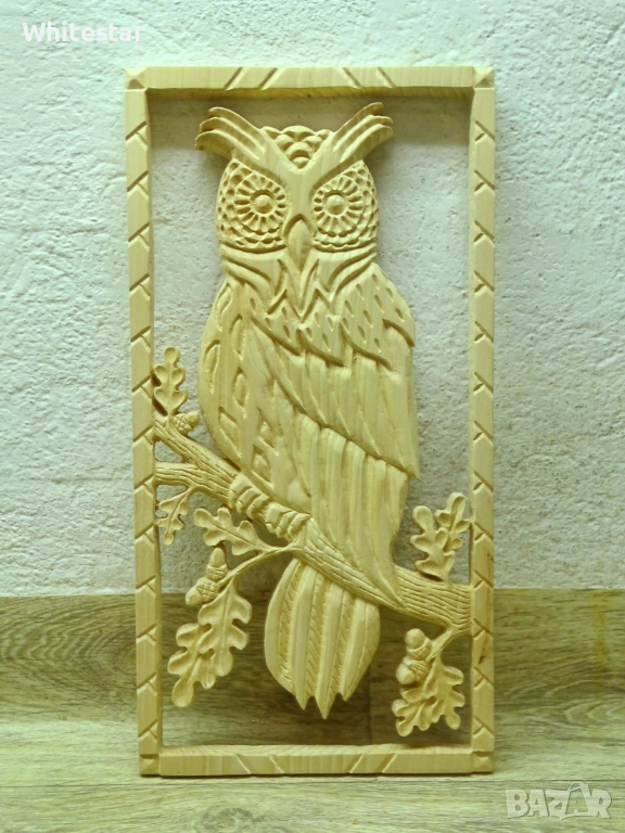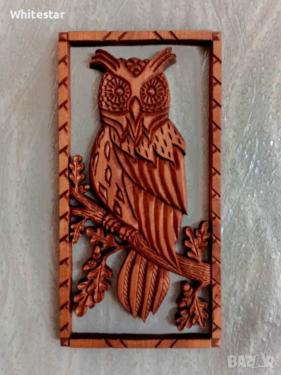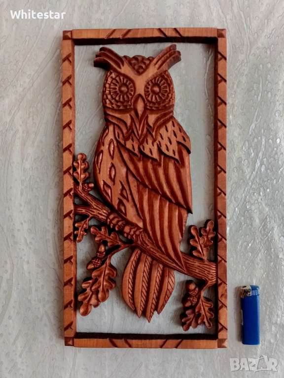 Ажурна, авторска, ръчна дърворезба - "Кацнала сова на клонка". Размери: 43см х 22см, материал: липа, покритие: байц "тъмна череша" и импрегнант. Налична. При интерес - доставка с фирми Еконт / Спиди, при условията на наложен платеж.