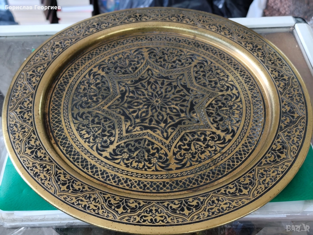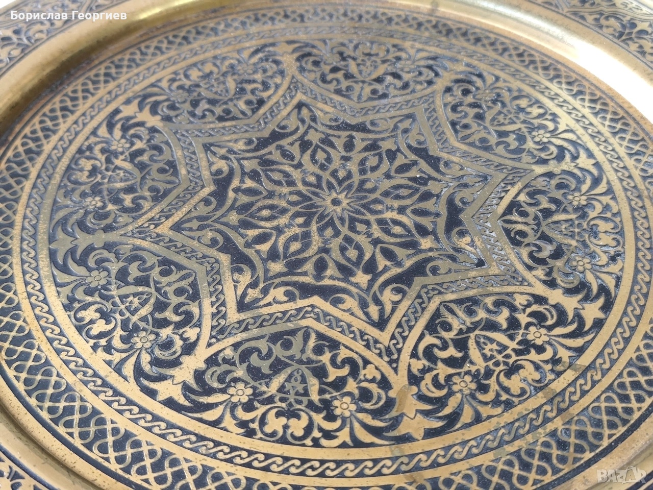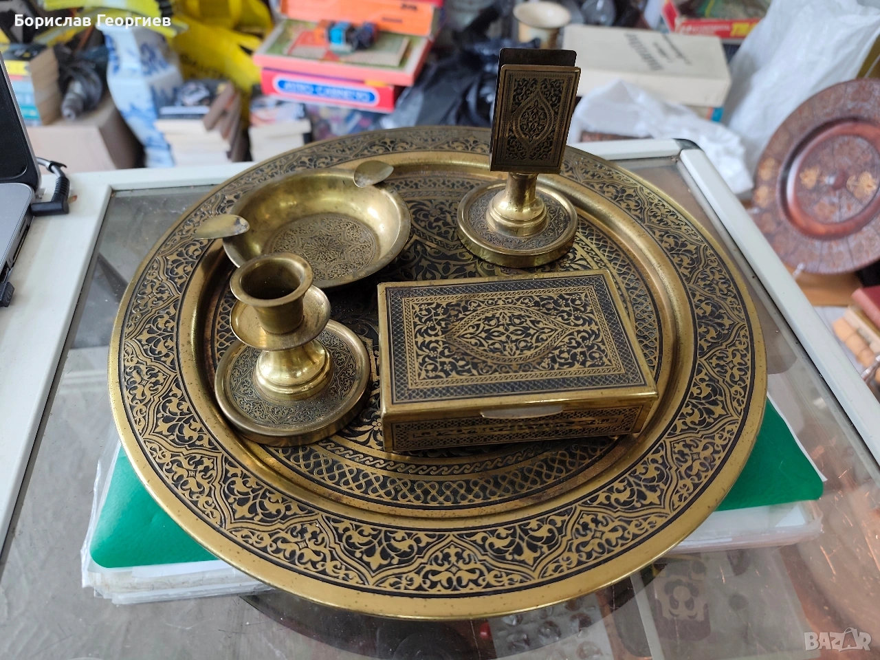 Комплекта съдържа пепелник ,държач за кибрити,кутия за цигари,свещник и поднос с диаметър 33 см.Материал месинг.