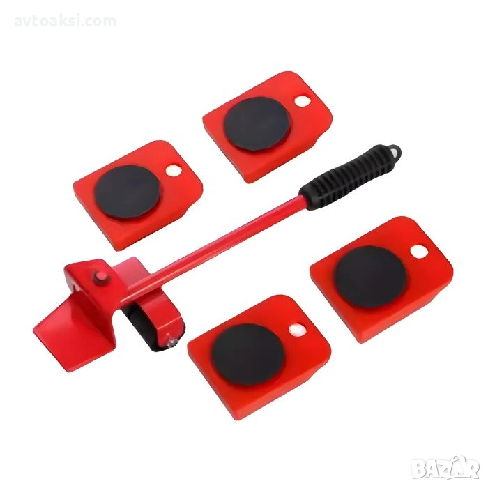 Комплекта съдържа: 1 бр. лост с гумирана дръжка и колелце за повдигане, 4 бр. подложки с колелца за преместване